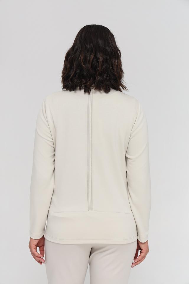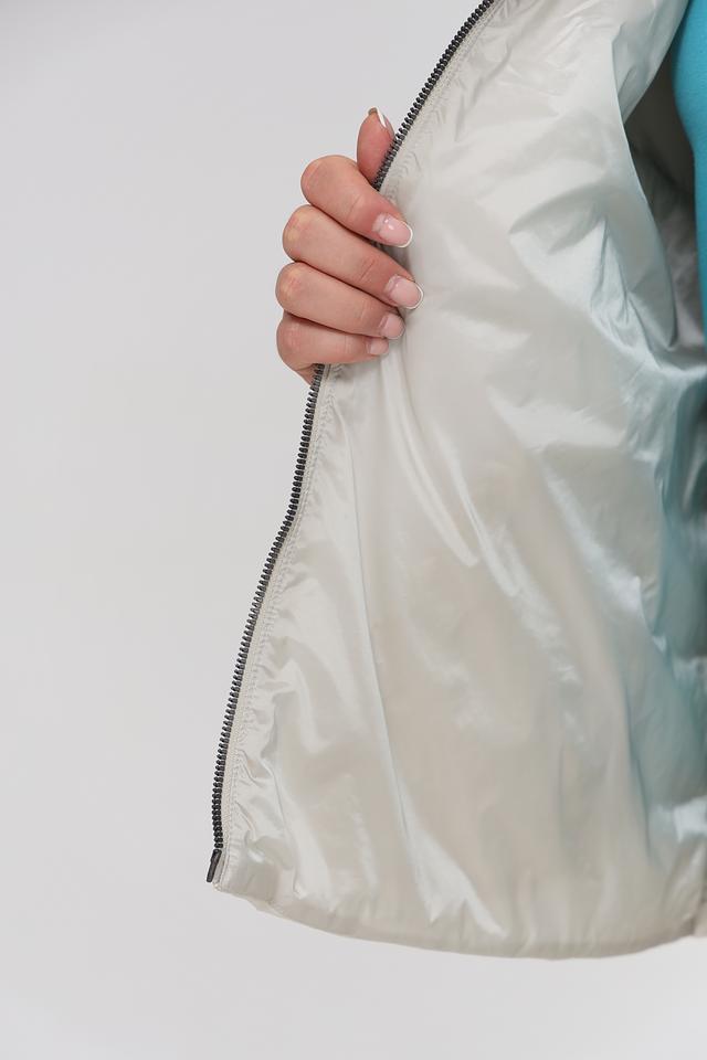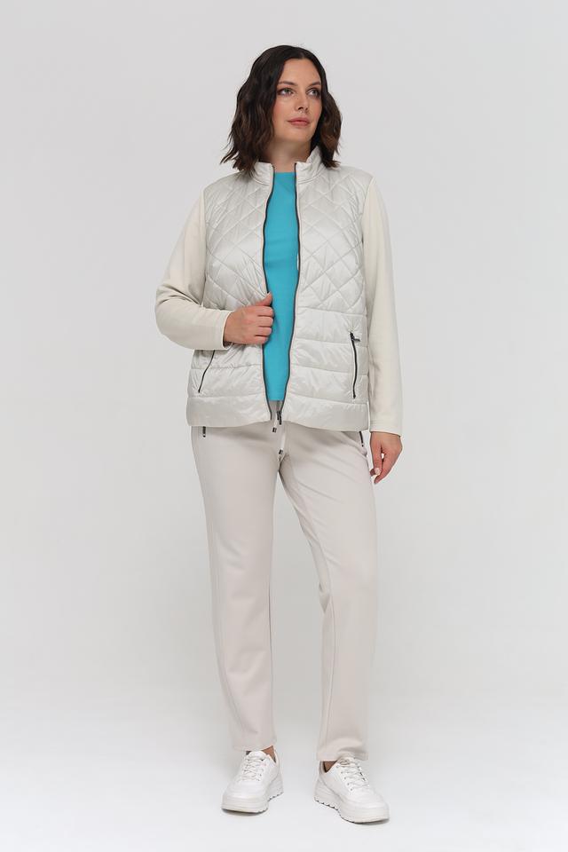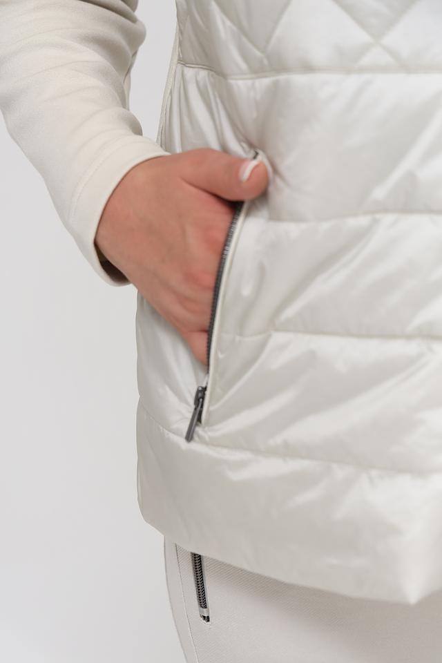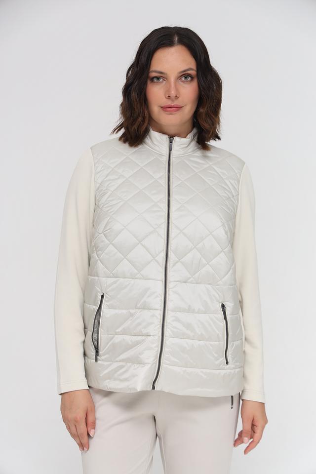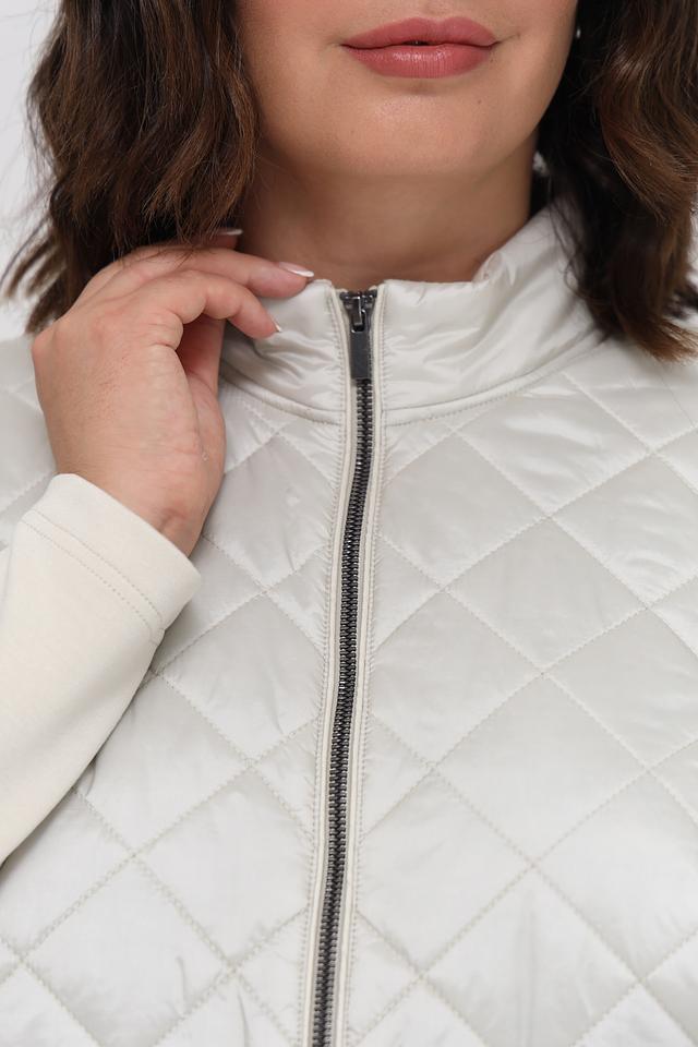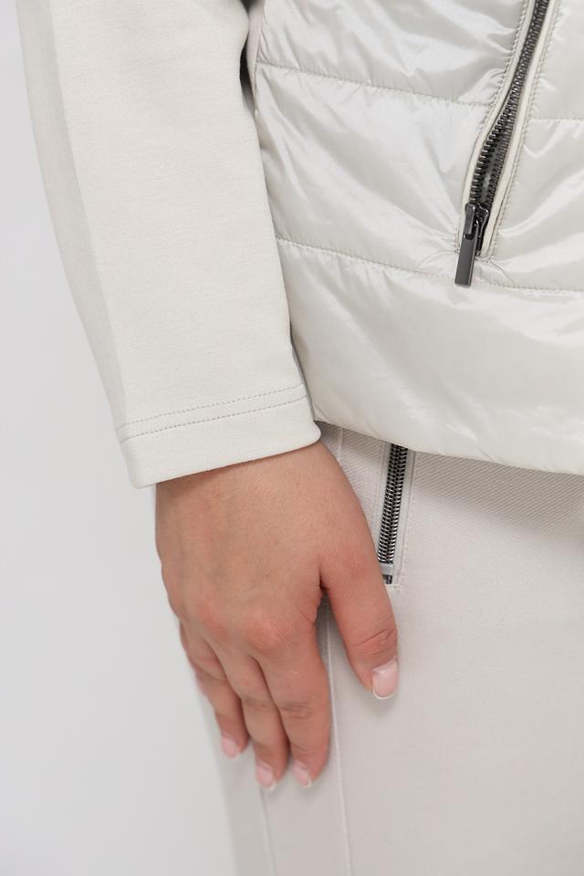 Куртка имеет стеганую переднюю часть, выполненную в бежевом цвете, что придает ей элегантный вид. Рукава выполнены из гладкой ткани, контрастирующей с текстурой стежки. Застежка-молния обеспечивает удобство и надежность.