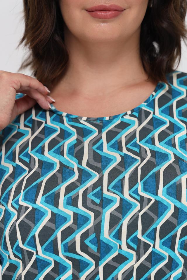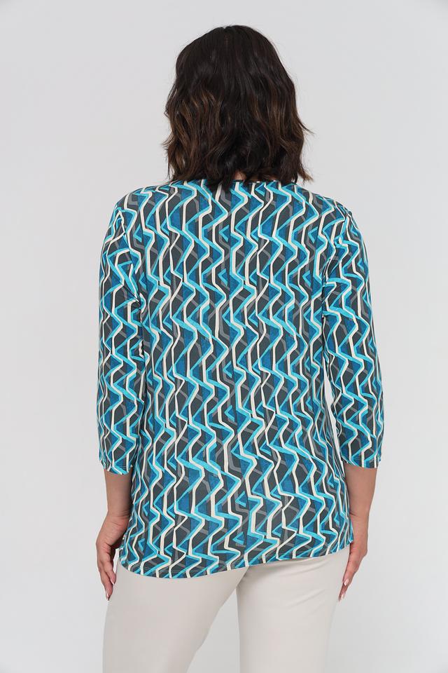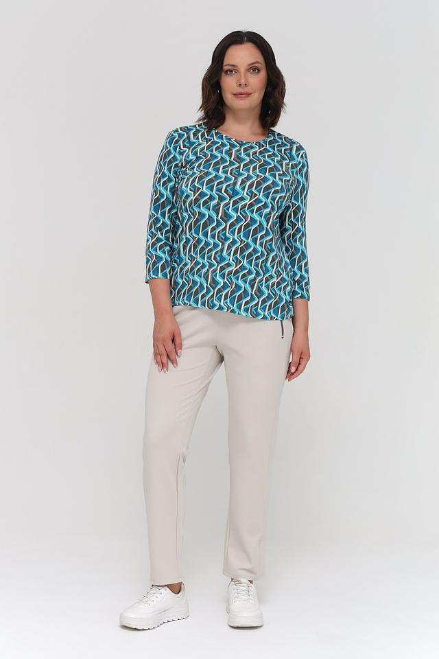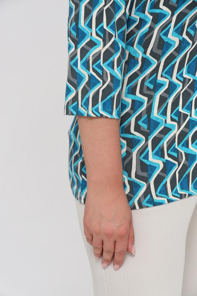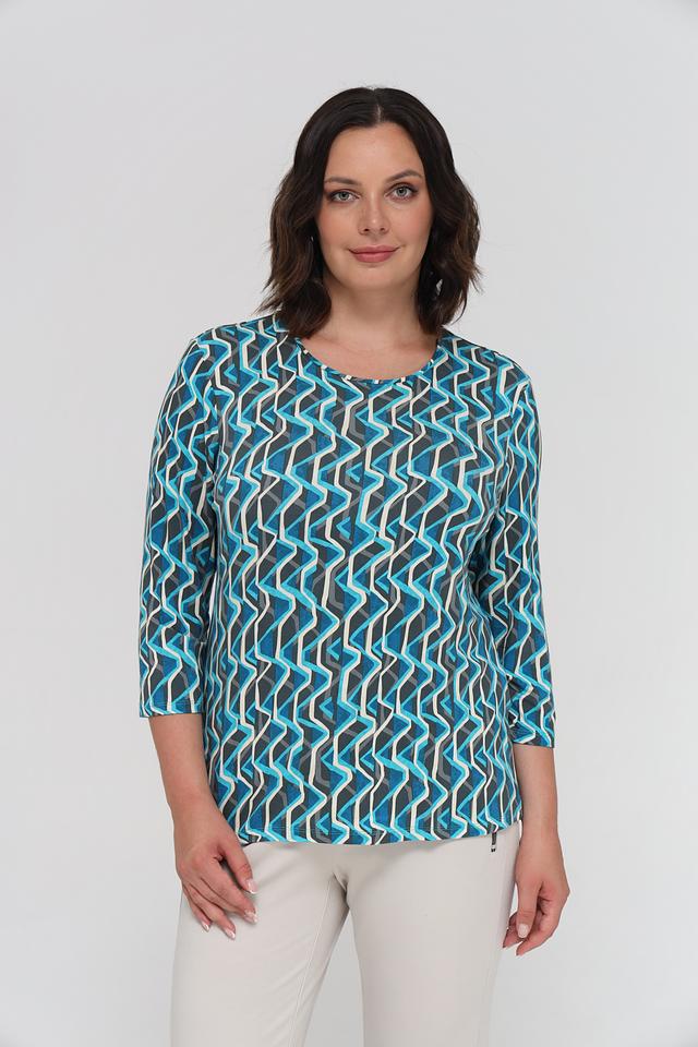 Лонгслив имеет оригинальный геометрический принт в бирюзовых, серых и белых тонах. Круглый вырез горловины и рукава 3/4 делают его универсальным для различных образов.