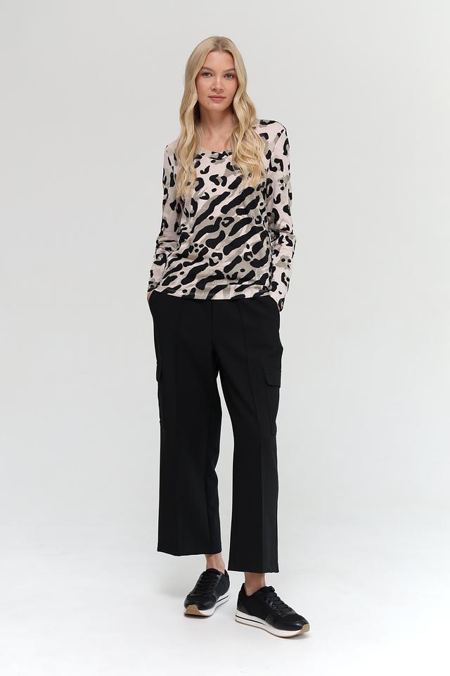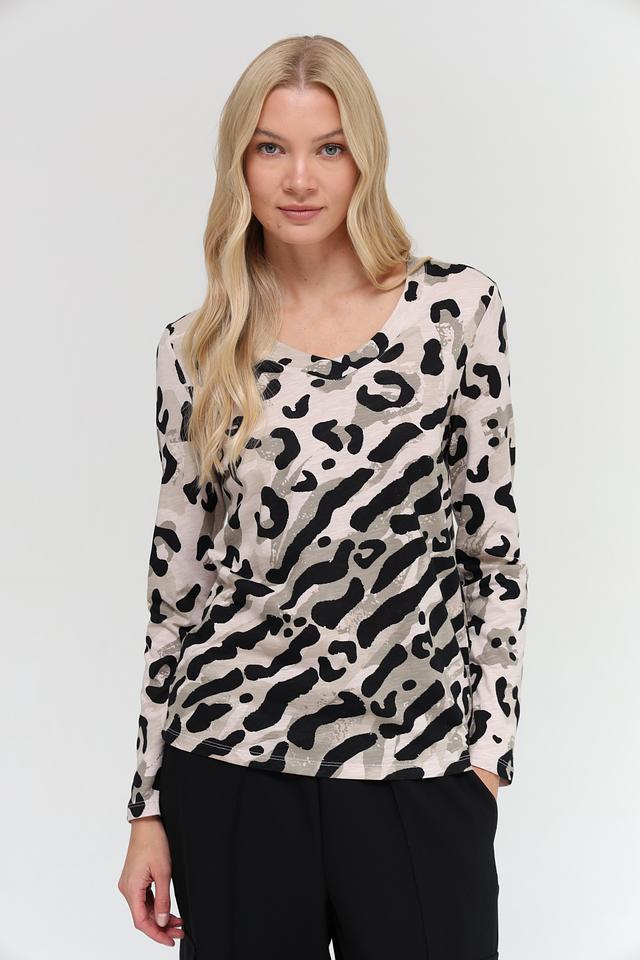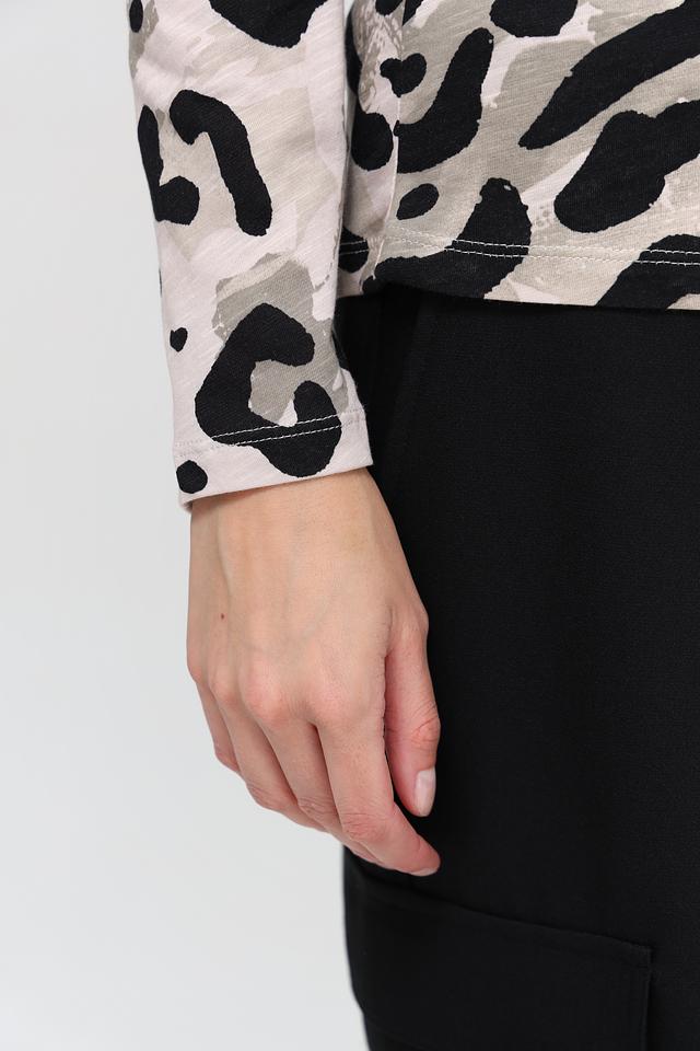 Лонгслив имеет свободный крой, который не сковывает движения. V-образный вырез горловины придает образу женственность. Главная особенность модели – эффектный принт, сочетающий в себе элементы анималистических рисунков.