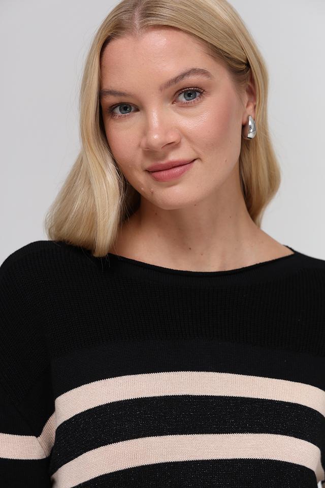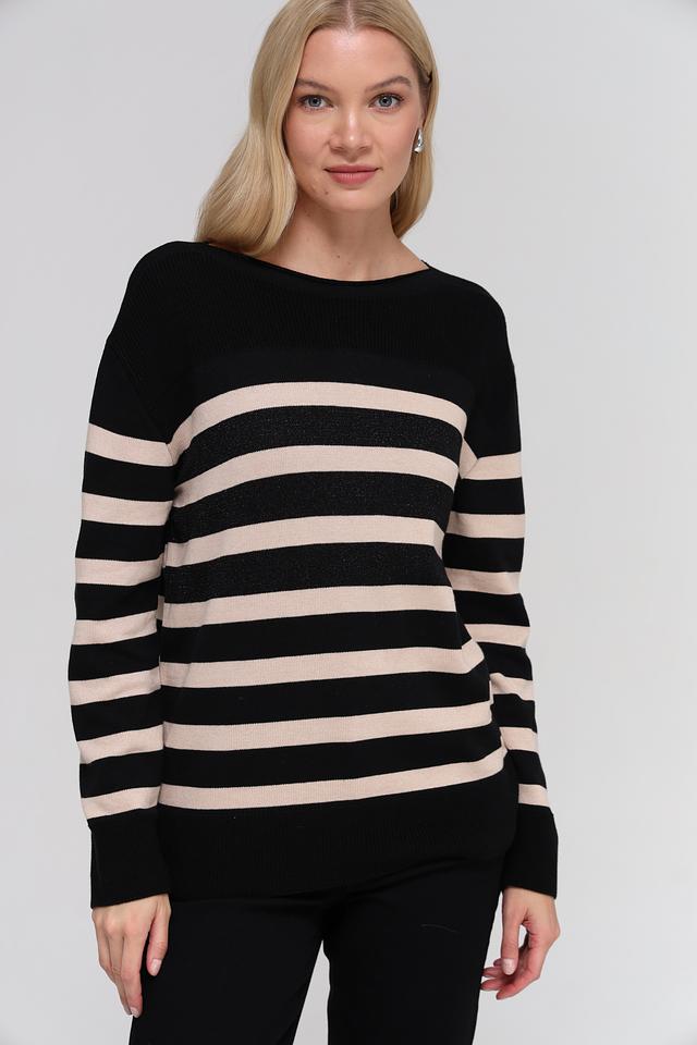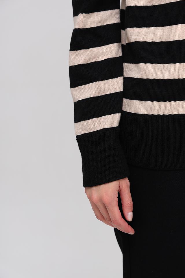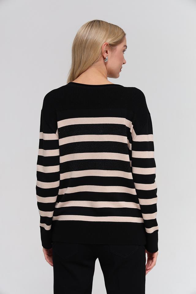 Основной цвет пуловера – чёрный, он разбавлен широкими бежевыми полосами, которые визуально освежают образ. В составе изделия преобладают натуральные и синтетические волокна: 48% полиакрил, 48% хлопок и 4% метализированная нить.