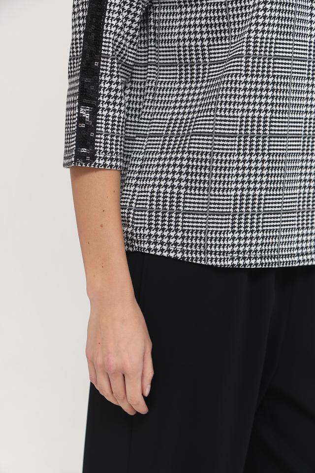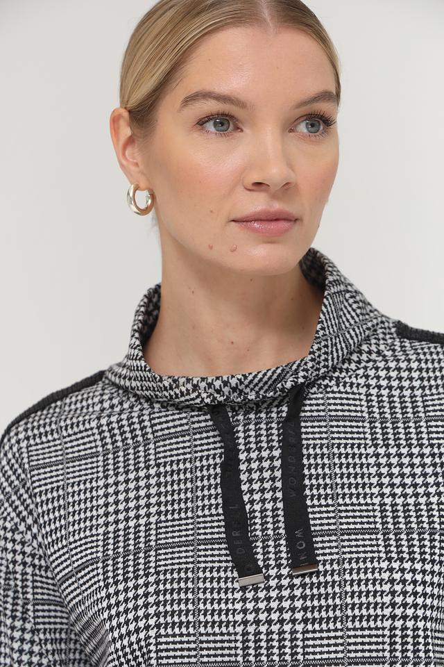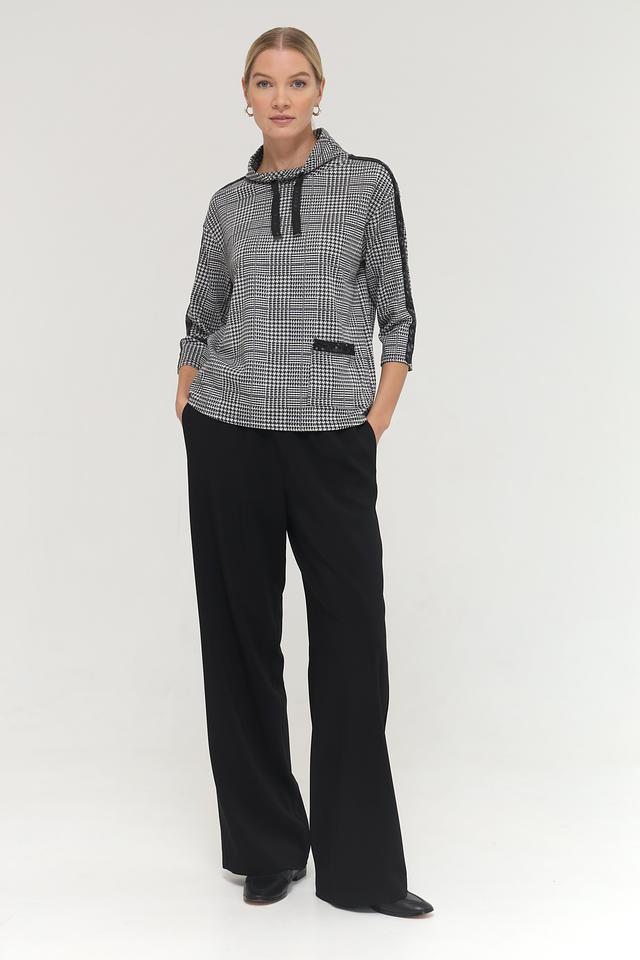 Женский пуловер Lebek чёрно-белого цвета с оригинальным дизайном в клетку и удобным воротником-стойкой. Модель дополнена шнурками на воротнике и боковыми вставками. Идеальный выбор для создания стильного и комфортного образа. Состав: полиэстер 86%, вискоза 12%, эластан 2%