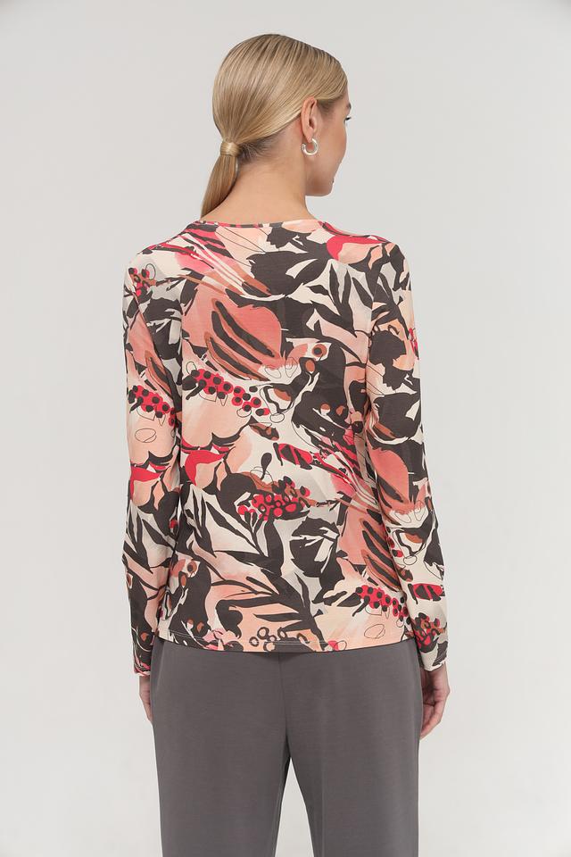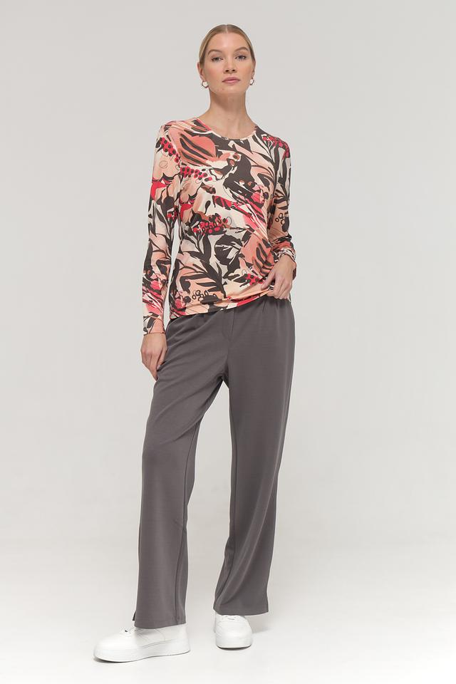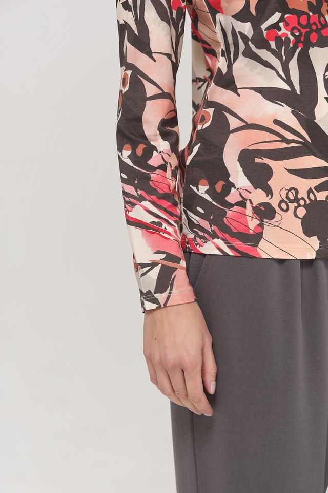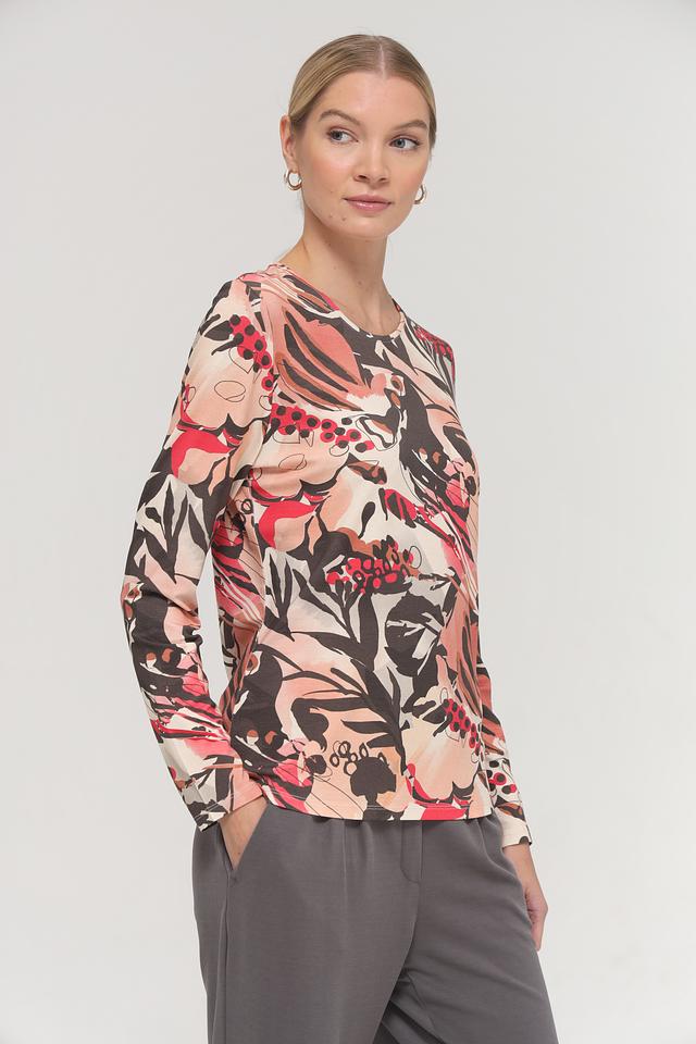 Футболка имеет длинные рукава и классический круглый вырез горловины. Главной особенностью модели является яркий и оригинальный цветочный принт, выполненный в сочетании розовых, красных и коричневых оттенков на бежевом фоне. Такой рисунок добавит образу женственности и индивидуальности.
