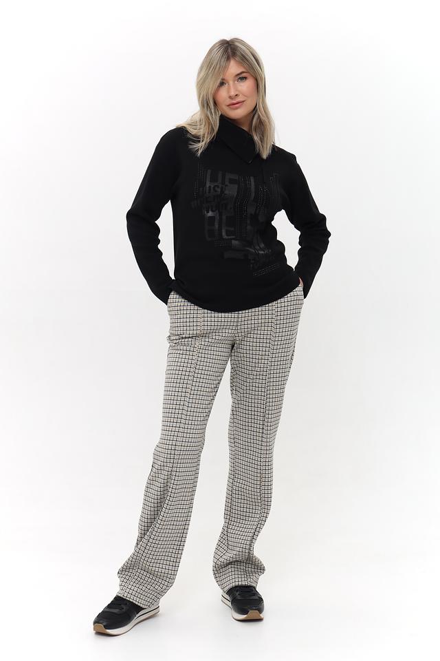 Пуловер имеет удобный крой и выполнен из приятного на ощупь трикотажа, состоящего из 50% хлопка и 50% полиакрила. Декоративный принт, выполненный в виде абстрактных блоков и украшенный стразами, придает изделию особый шарм и индивидуальность.