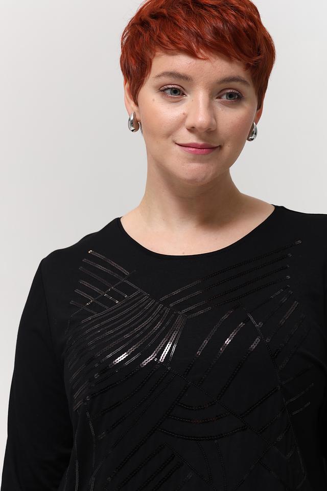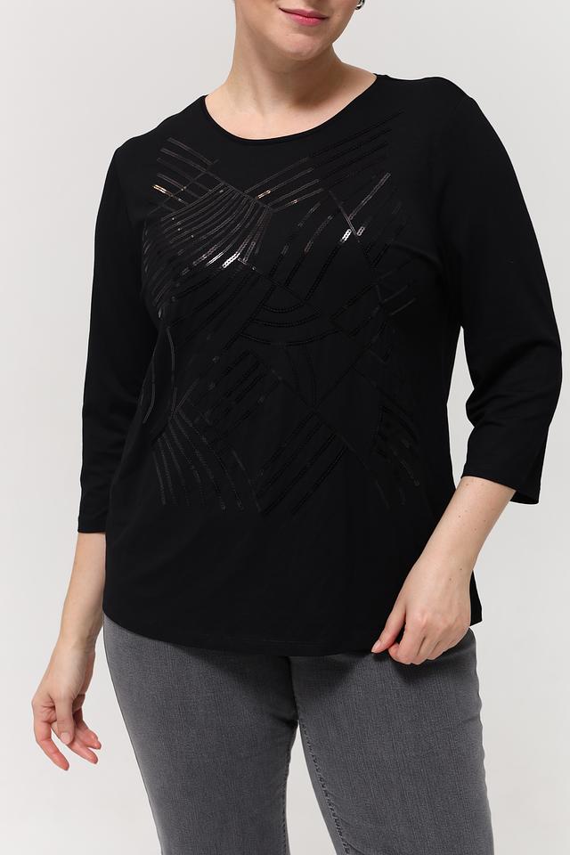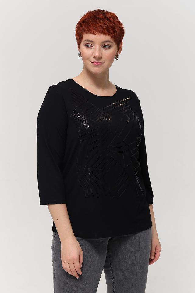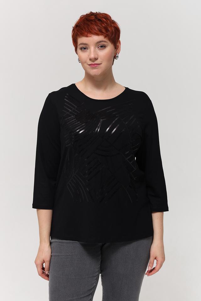 Чёрная футболка Lebek из вискозы с оригинальным геометрическим узором. Модель с рукавом 3/4 и округлым вырезом горловины. Состав: 95% вискоза, 5% эластан. Состав: вискоза 95%, эластан 5%