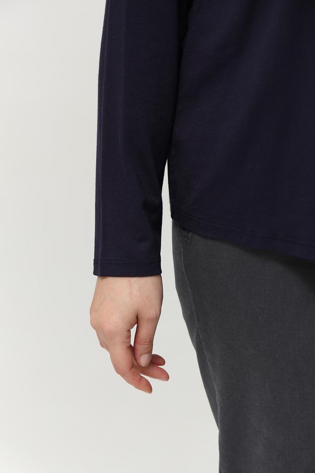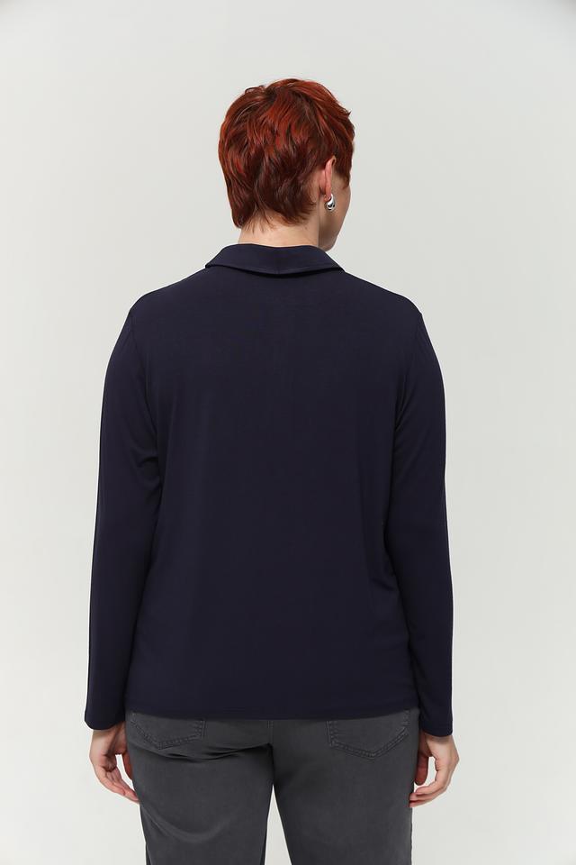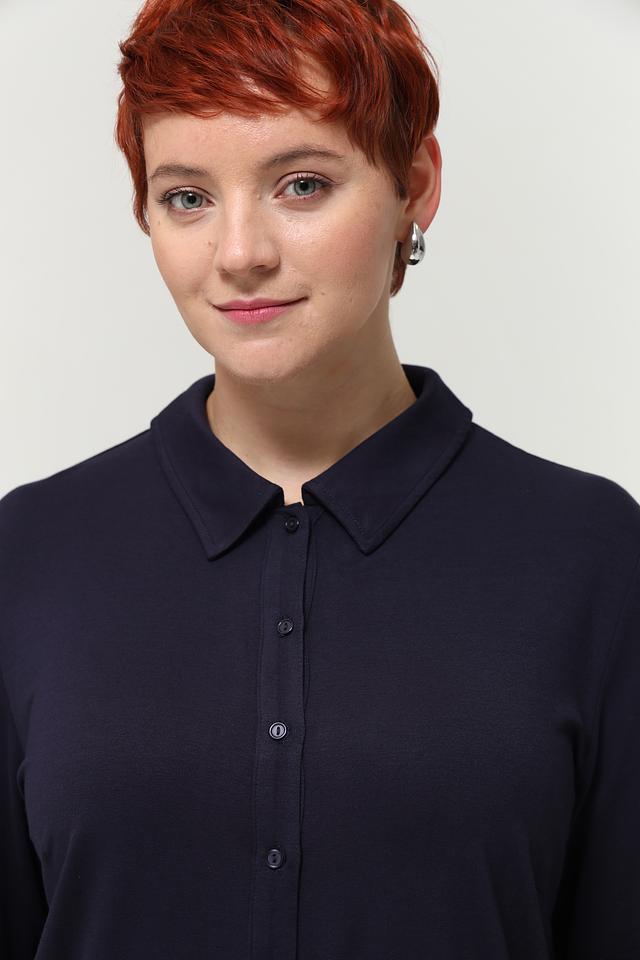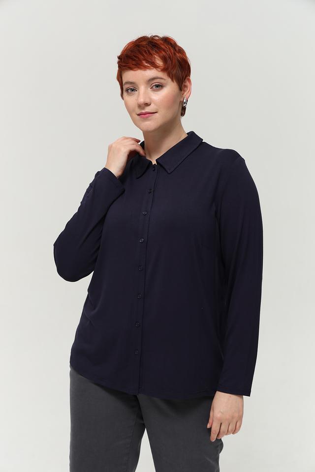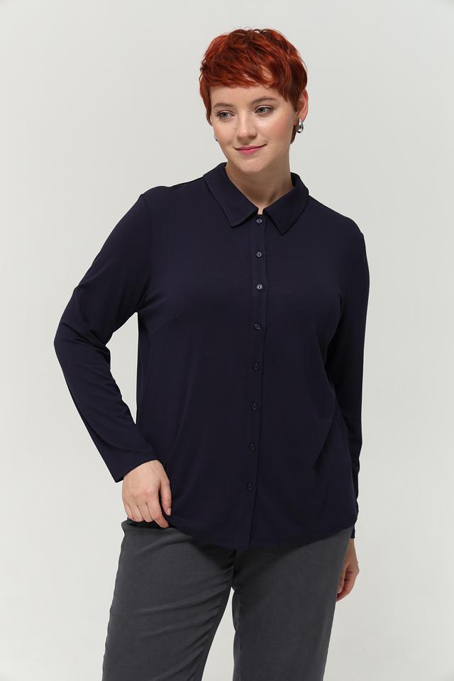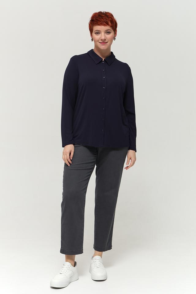 Рубашка имеет прямой силуэт, который подойдет для разных типов фигур. Она идеально сочетается с брюками, юбками и джинсами, позволяя создавать разнообразные образы – от деловых до повседневных. Темно-синий цвет делает эту рубашку универсальной и легко комбинируемой с другими элементами одежды.