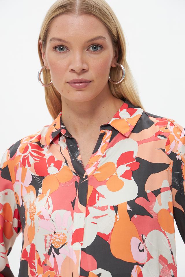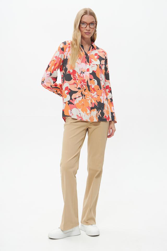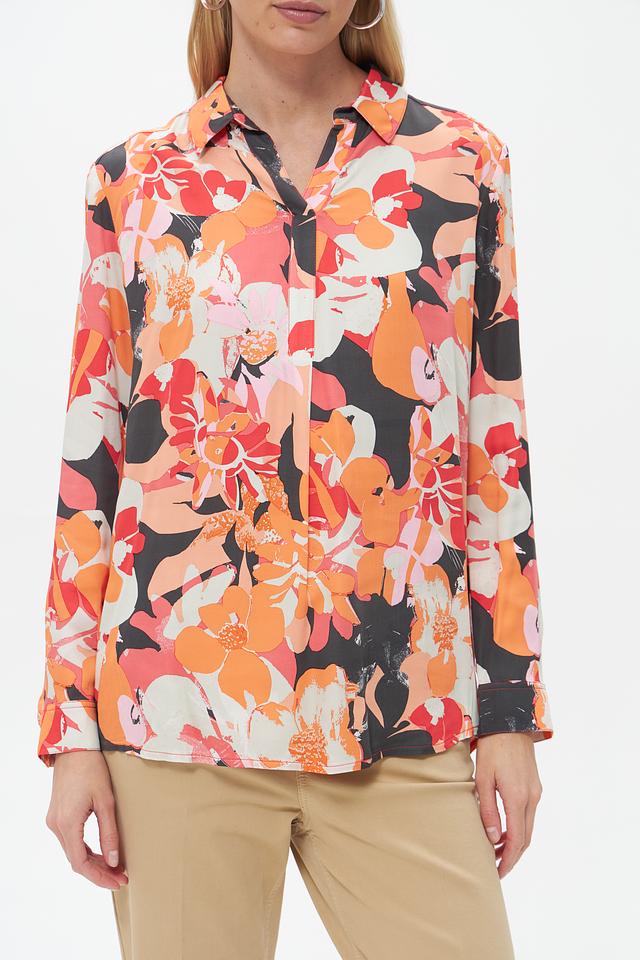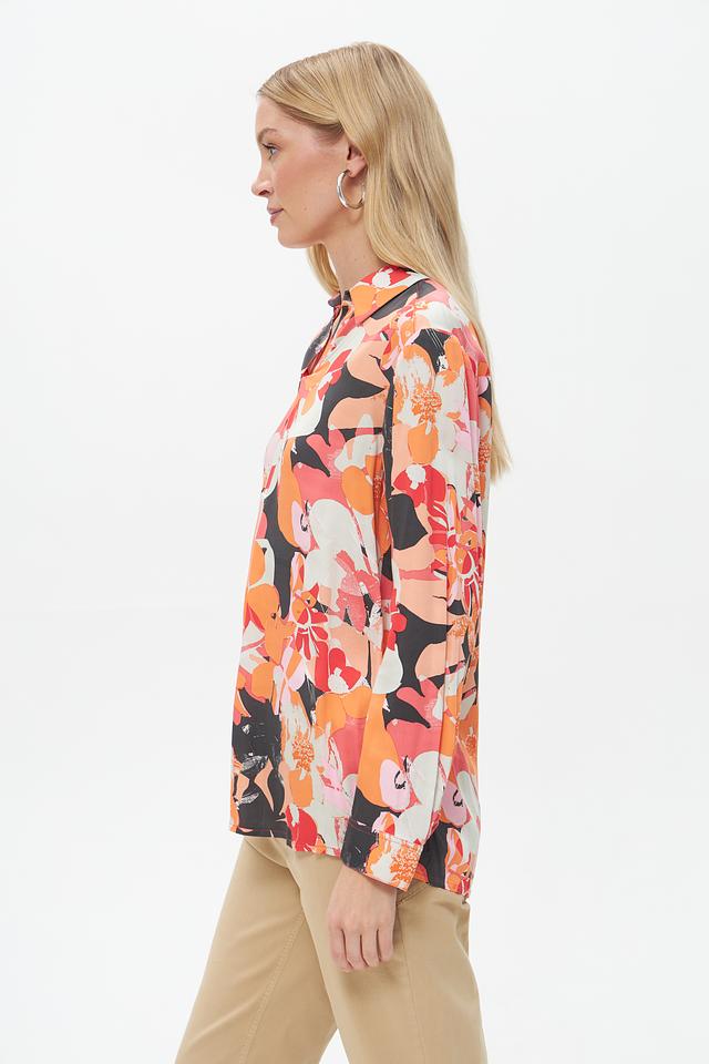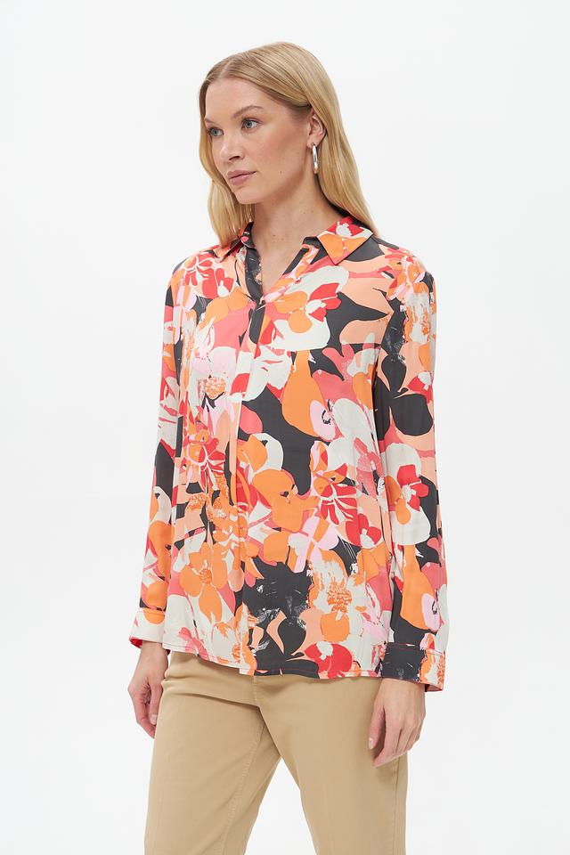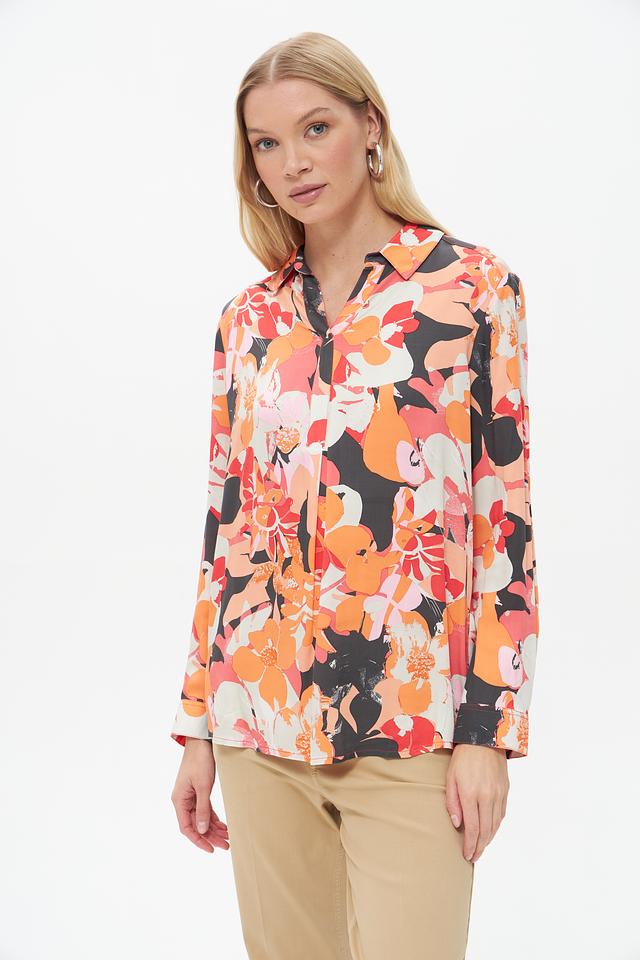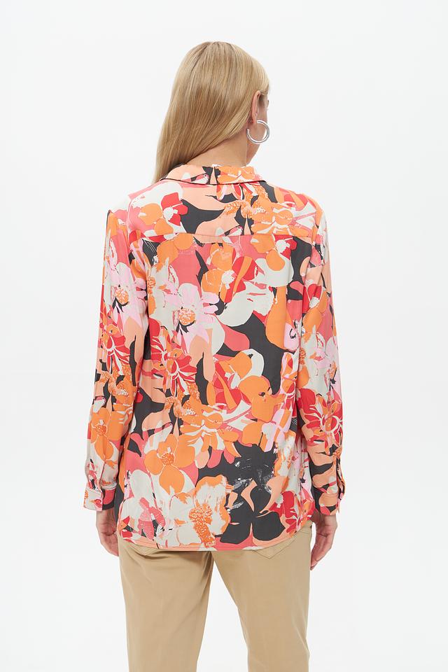 Блузка имеет классический крой с длинными рукавами и воротником на пуговицах. Яркий цветочный принт придает ей женственности и оригинальности. Свободный силуэт позволяет создать расслабленный, но элегантный образ.