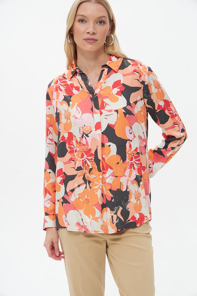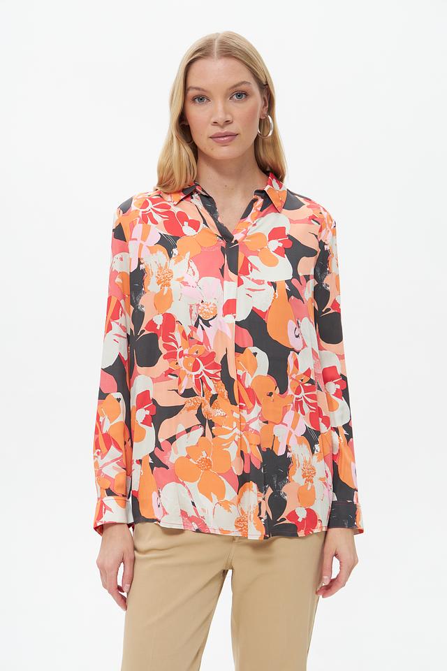 Блузка Lebek оранжевого цвета с ярким цветочным принтом выполнена из 100% вискозы. Свободный крой и длинные рукава делают её комфортной и универсальной для создания различных образов. Состав: вискоза 100%