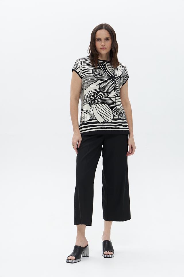Женская футболка Lebek чёрно-белого цвета с оригинальным цветочным принтом. Изготовлена из мягкой и приятной к телу вискозы с добавлением эластана. Состав: вискоза 92%, эластан 8%