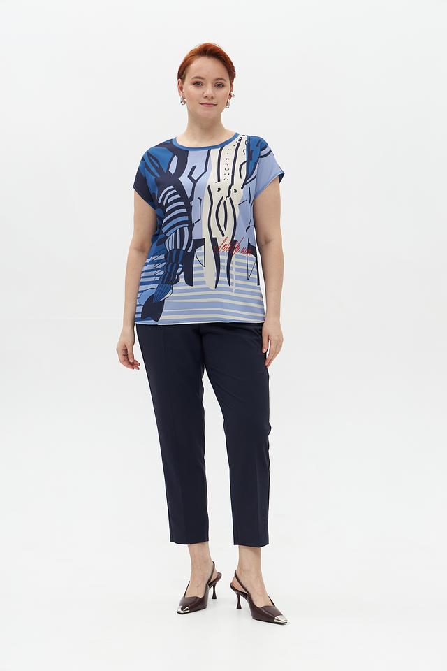 Блузка имеет свободный крой, короткие рукава и округлый вырез горловины. Главная особенность – эффектный принт с изображением креветок в сочетании полосок и абстрактных элементов. Цветовая гамма включает оттенки голубого, белого и синего.