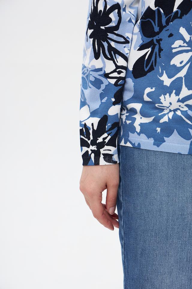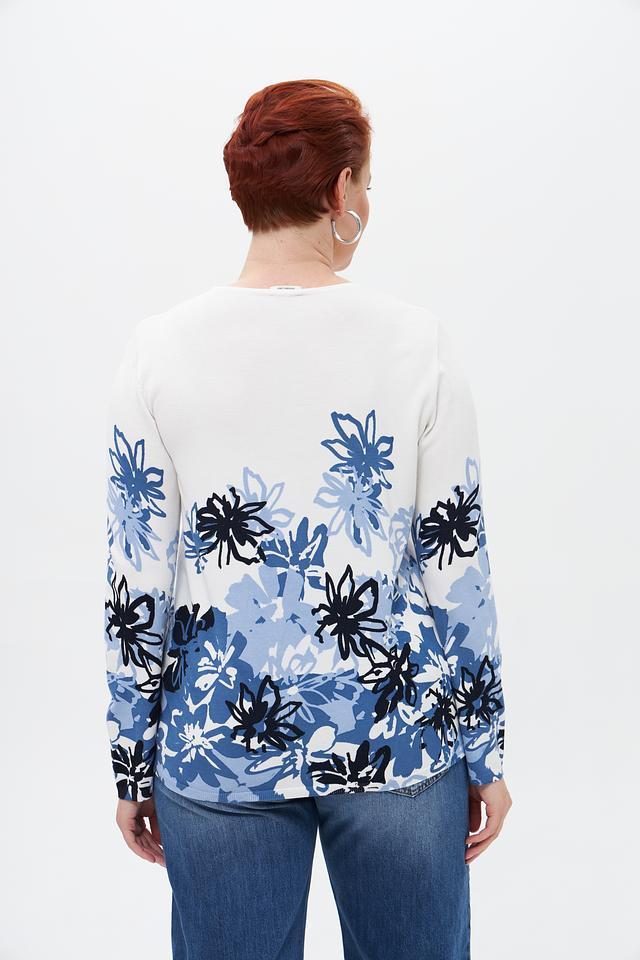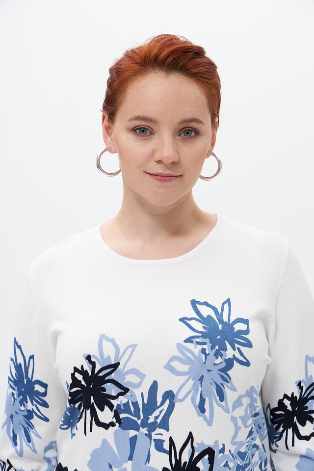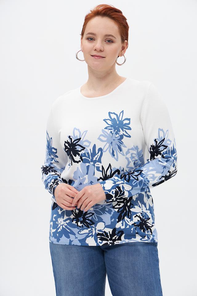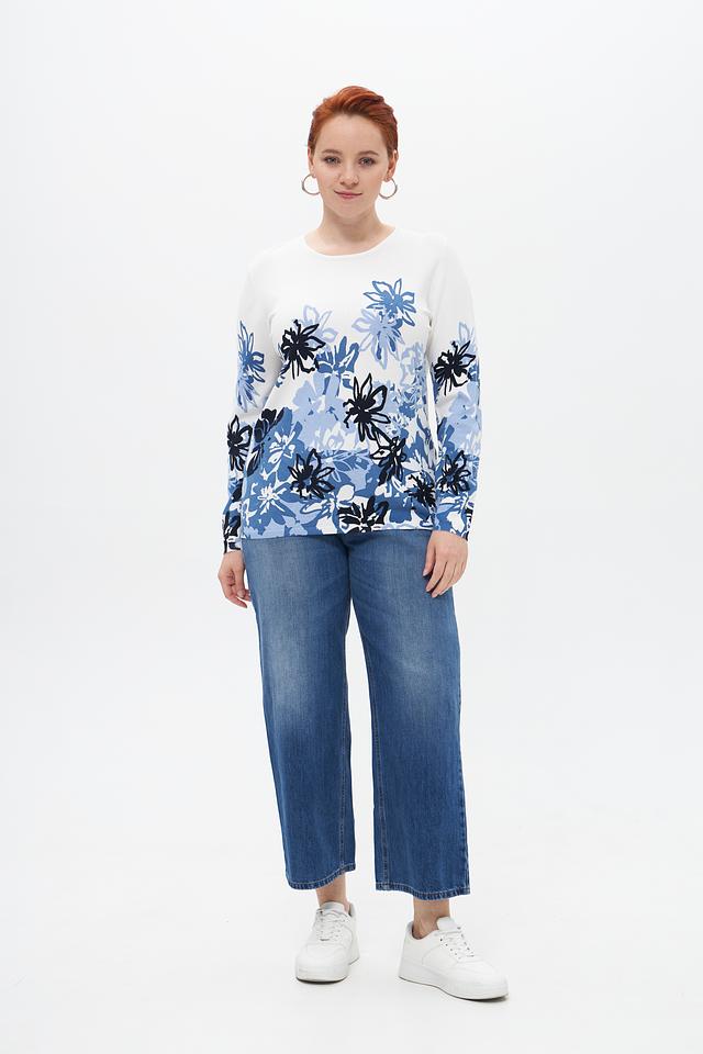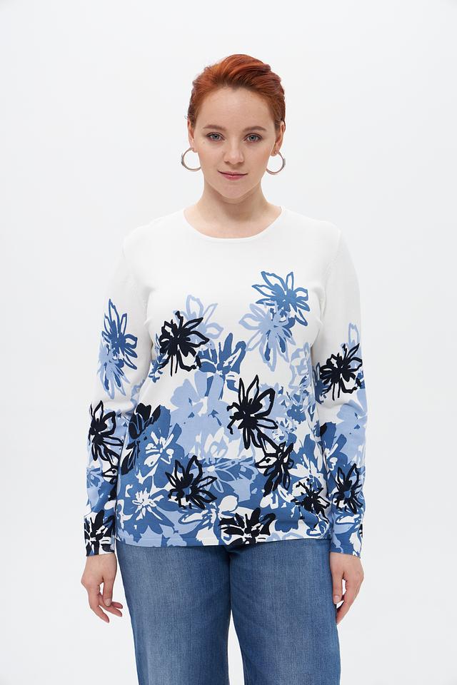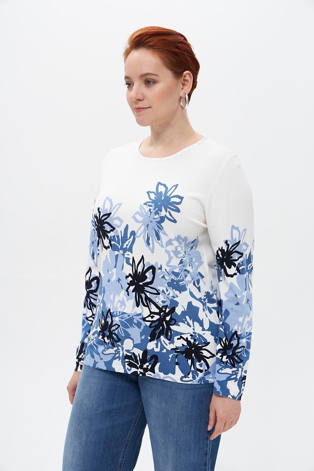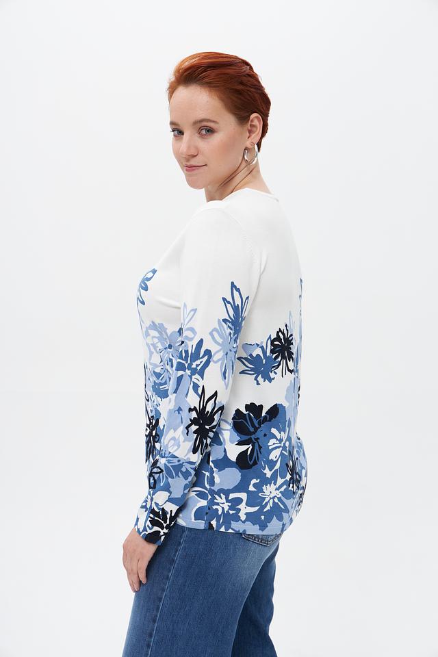 Женский пуловер от бренда Lebek выполнен в белом цвете и украшен ярким цветочным принтом в оттенках синего и голубого.