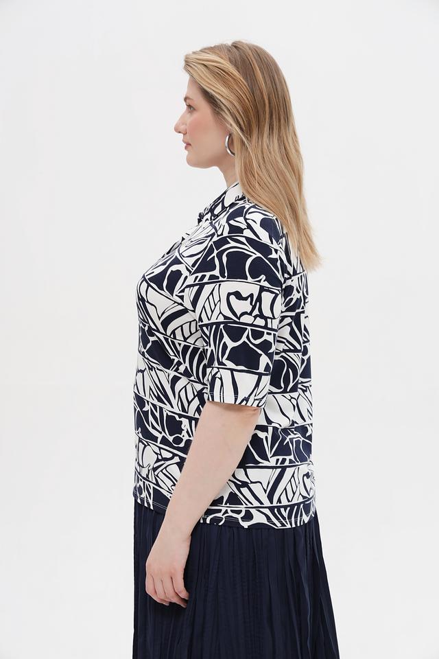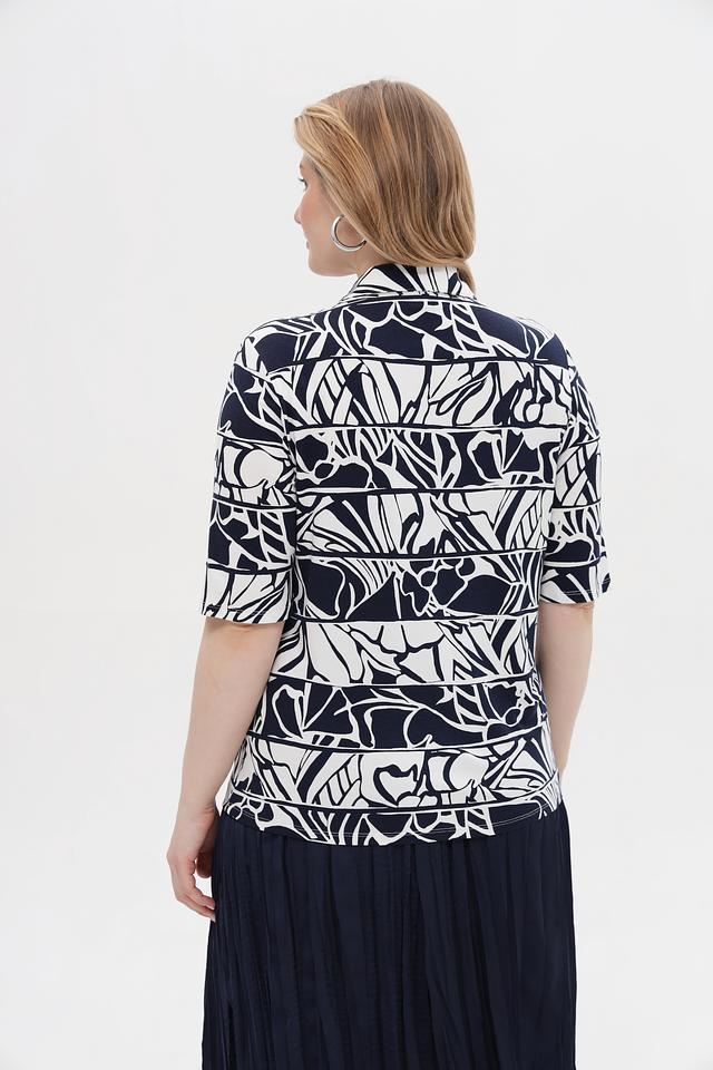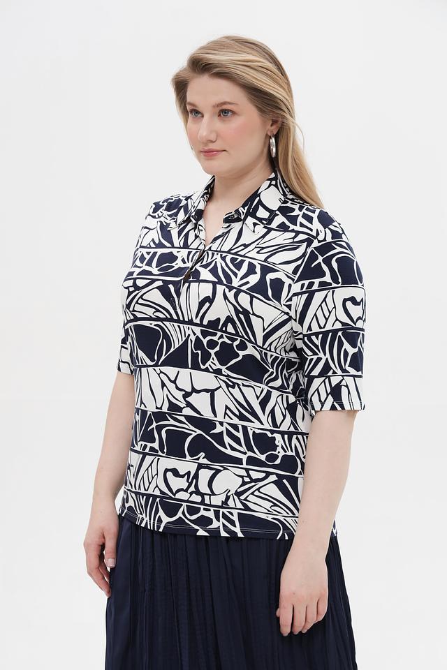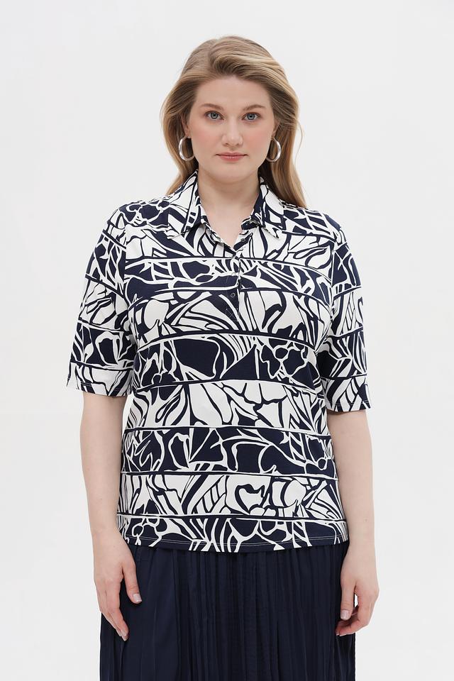Футболка имеет прямой крой и короткий рукав, что делает ее универсальной для различных образов. Воротник-стойка добавляет изысканности, а яркий сине-белый принт придает индивидуальность.