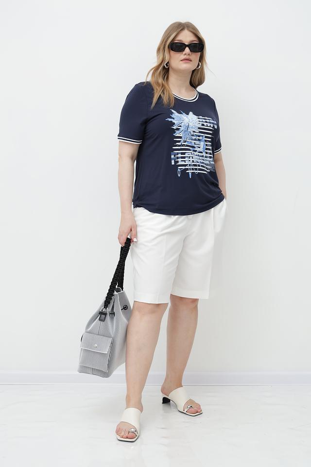 Футболка имеет классический прямой крой и короткий рукав, обрамленный белой полоской. Особый акцент сделан на яркий принт на лицевой стороне, выполненный в голубых тонах. Белая окантовка горловины добавляет контрастности и завершенности образу.