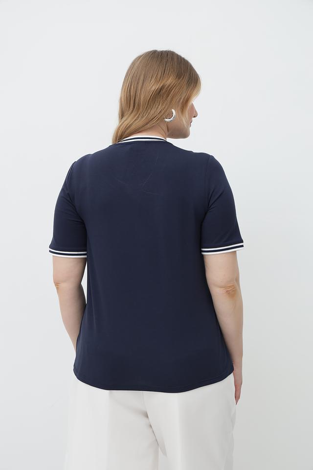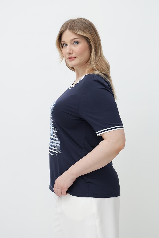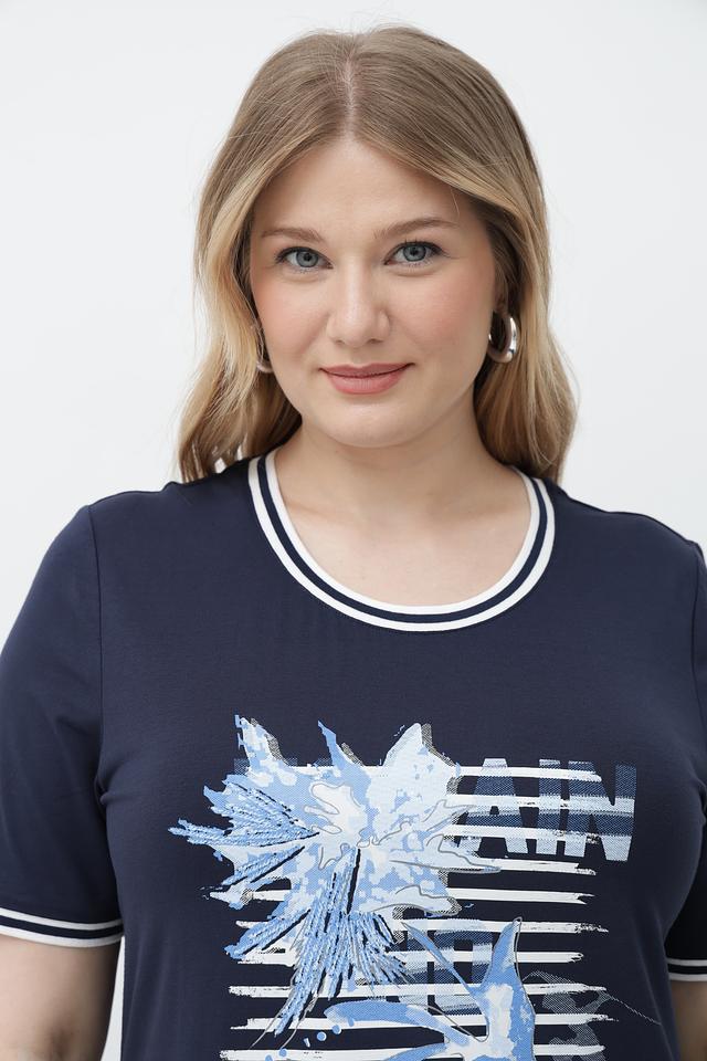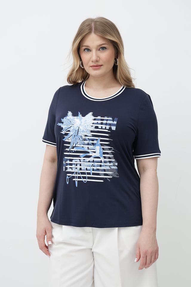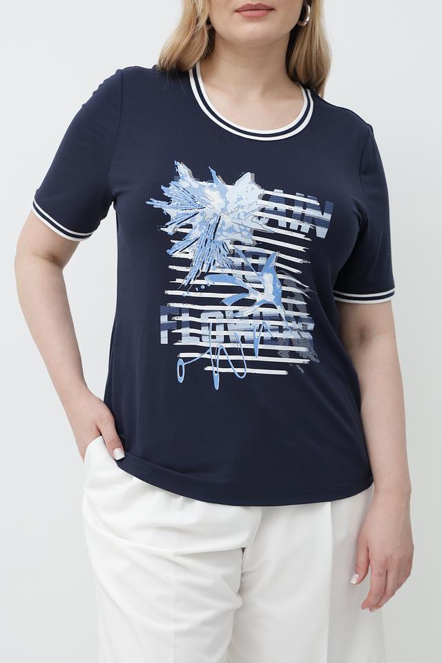 Синяя футболка от Lebek с оригинальным принтом и белой отделкой горловины и рукавов. Изготовлена из мягкой вискозы с добавлением эластана для комфорта и хорошей посадки. Состав: вискоза 95%, эластан 5%