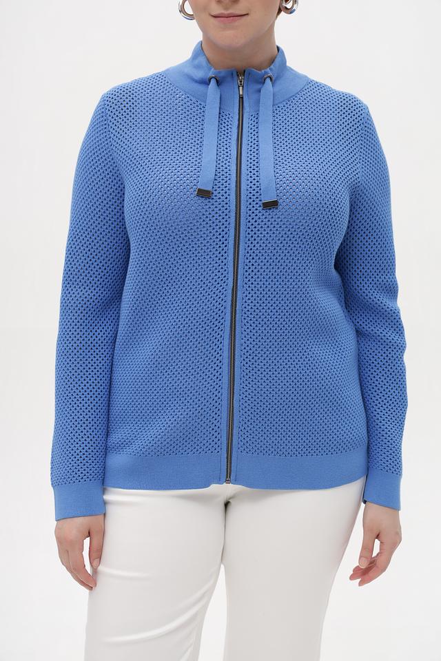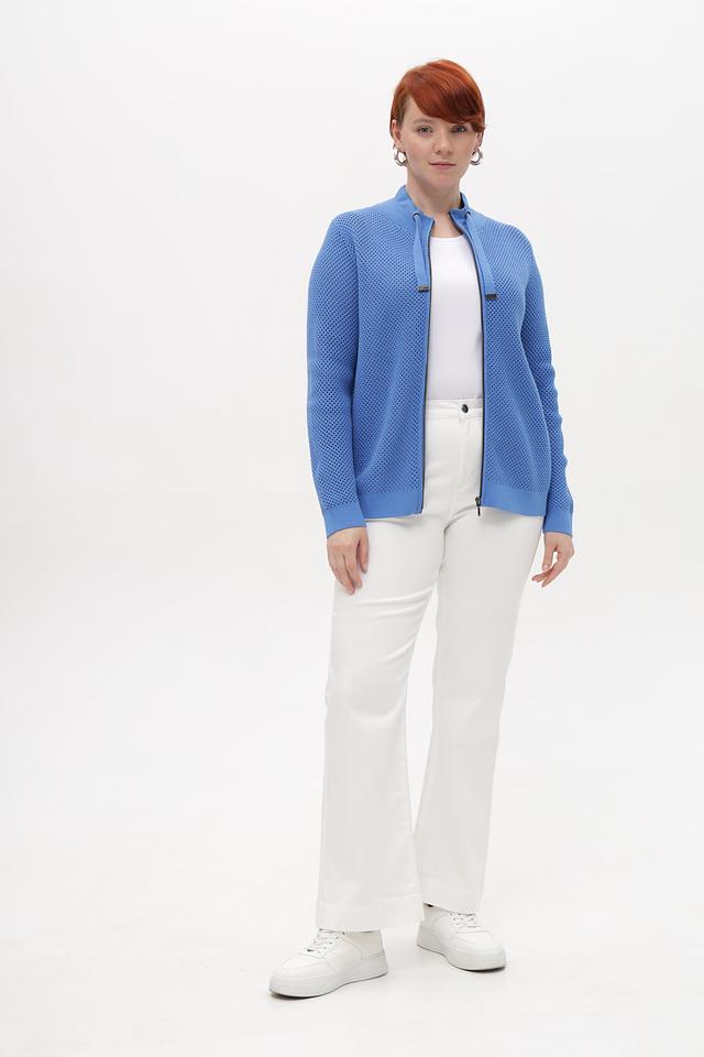 Голубой жакет от Lebek из перфорированного трикотажа на молнии. Модель выполнена из хлопка с добавлением полиакрила для мягкости и сохранения формы. Застежка – молния с двумя декоративными шнурками на воротнике. Состав: хлопок 50%, полиакрил 50%