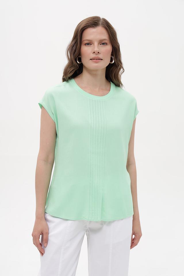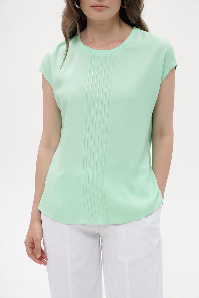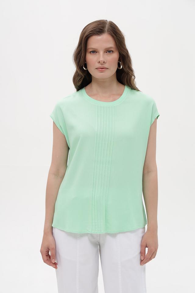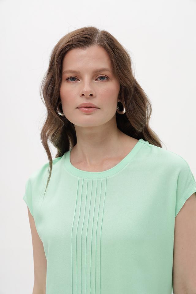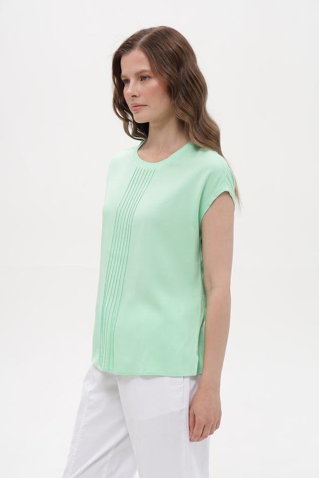 Блуза имеет прямой крой, короткие рукава и круглый вырез горловины. Особый акцент сделан на вертикальные декоративные складки, расположенные на передней части изделия, которые визуально вытягивают силуэт и придают блузе элегантный вид.