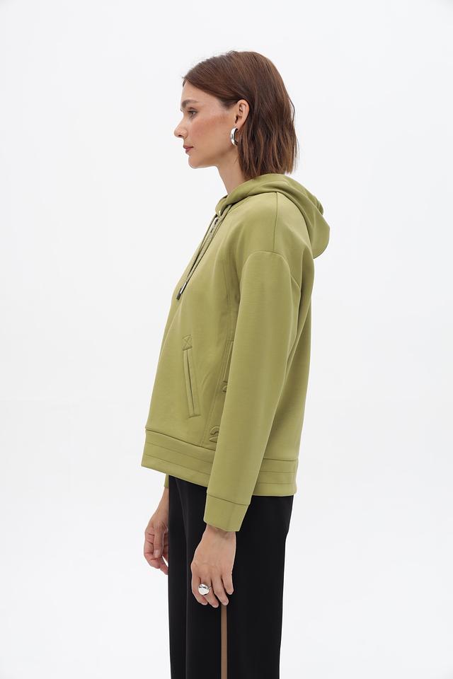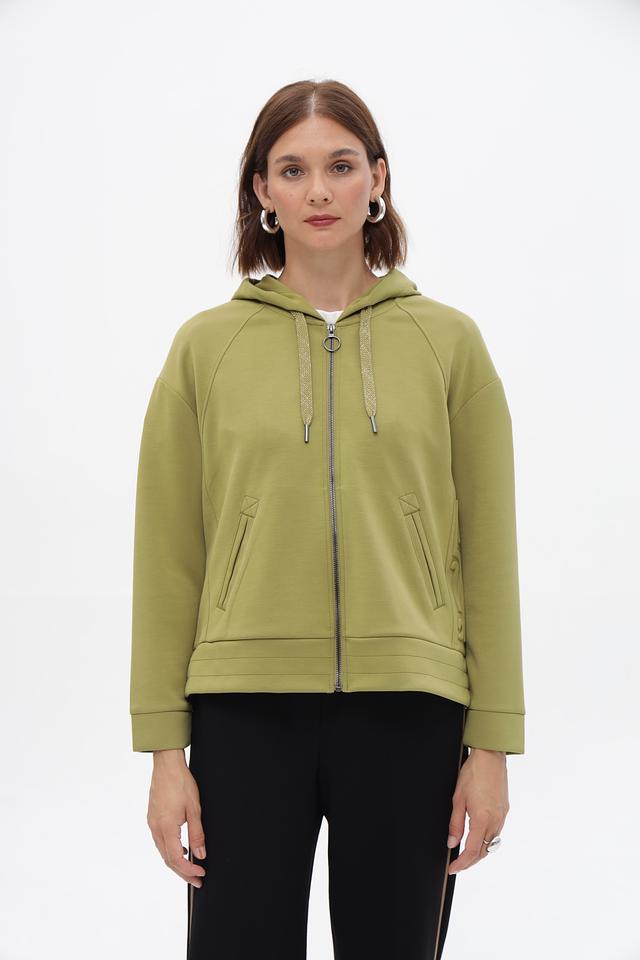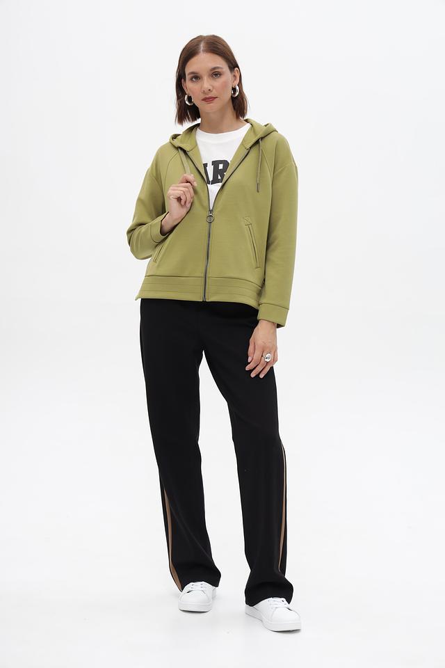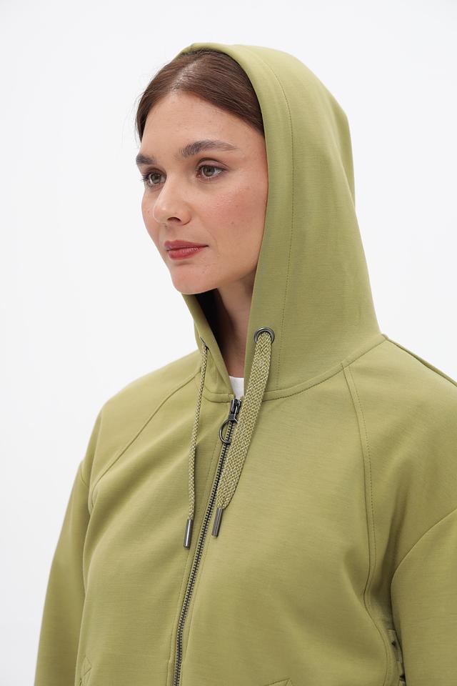 Жакет Lebek оливкового цвета – это стильная и удобная модель на молнии. Удлиненный крой и капюшон делают его практичным выбором для прохладной погоды. Жакет выполнен из мягкой ткани с добавлением вискозы и эластана. Состав: полиэстер 50%, вискоза 45%, эластан 5%