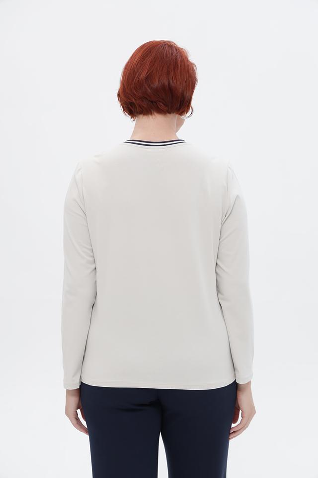 Эта стильная блуза от Lebek выполнена в нежном бежевом цвете и украшена эффектным принтом, выполненным в синих оттенках. Блуза имеет длинные рукава и круглый вырез горловины, отделанный тонкой синей полоской.
