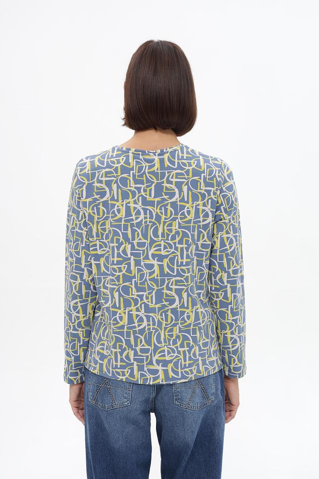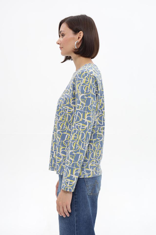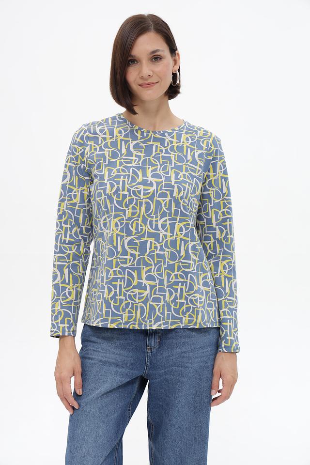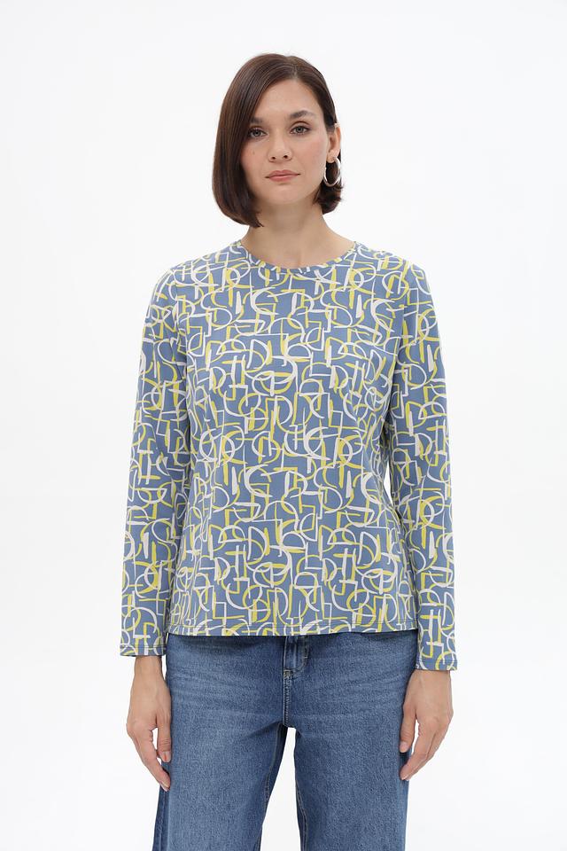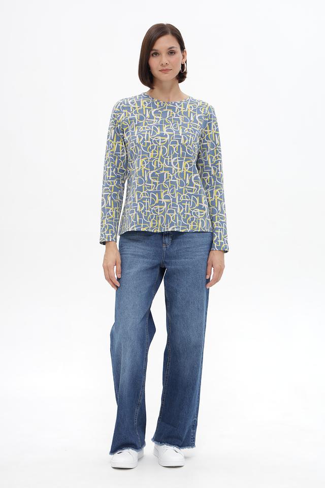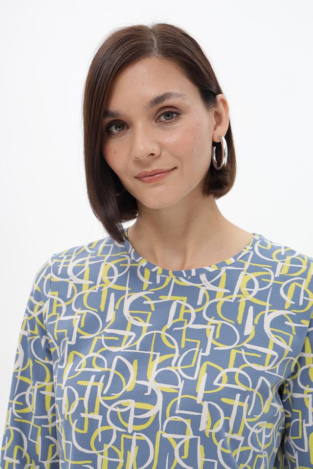 Блуза имеет классический крой с длинными рукавами и круглым вырезом горловины. Главная особенность модели – стильный геометричный принт в голубых и жёлтых тонах, который придаёт ей современный и интересный вид.