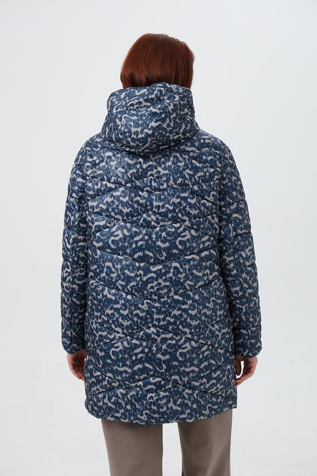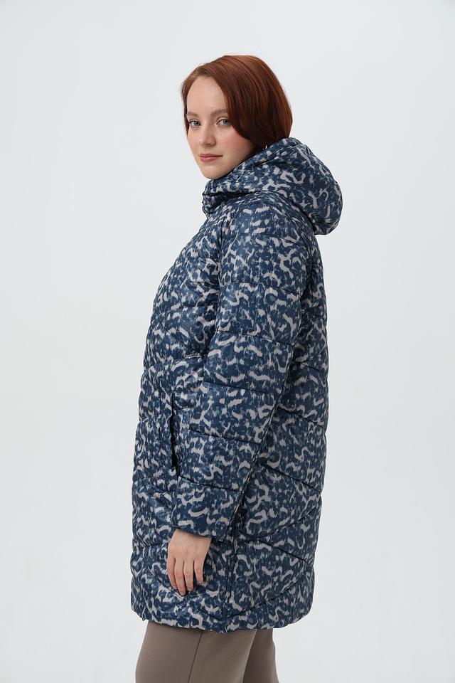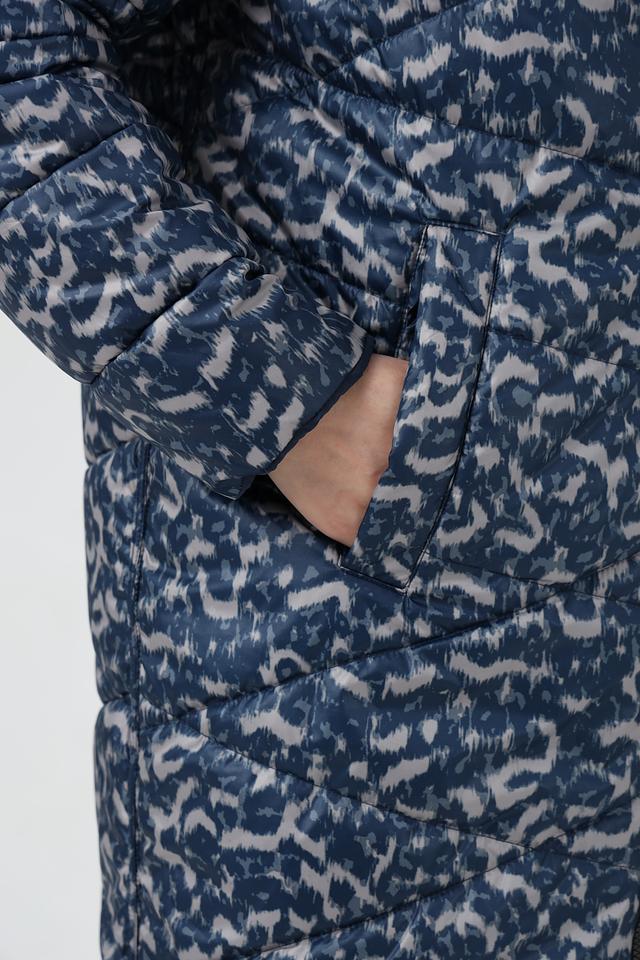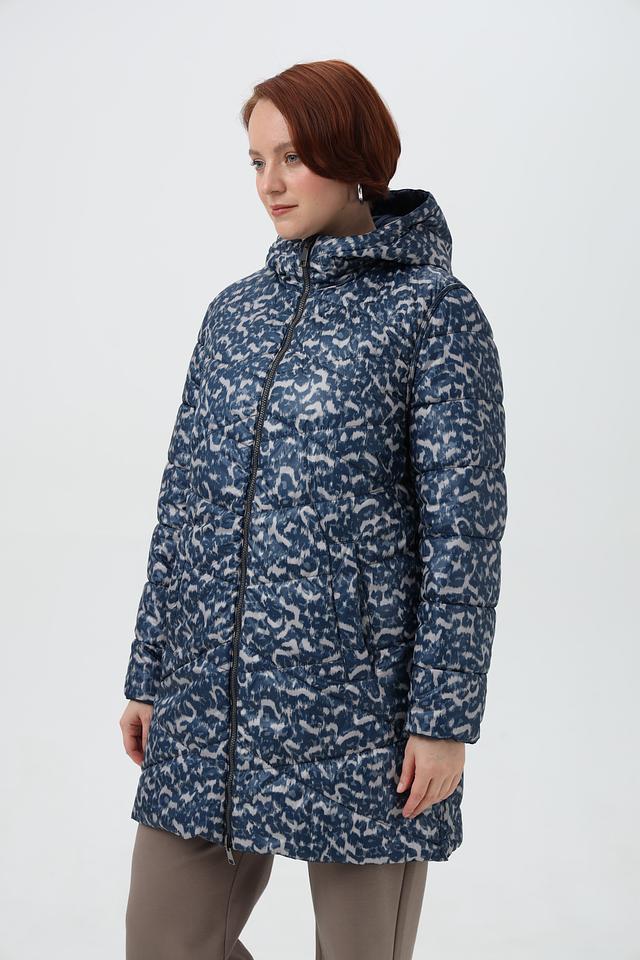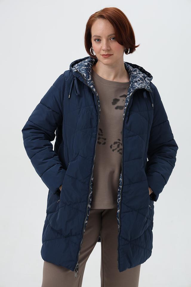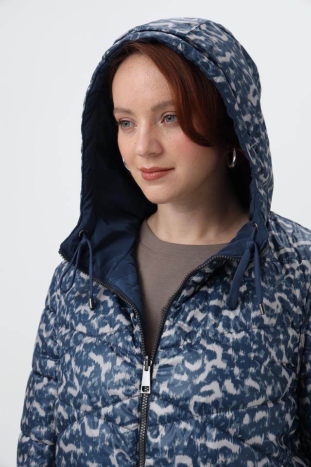 Куртка имеет удлиненный силуэт и стеганую фактуру, что придает ей современный и элегантный вид. Капюшон с принтом добавляет оригинальности образу. Застежка-молния обеспечивает удобство и надежность.