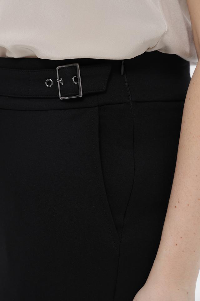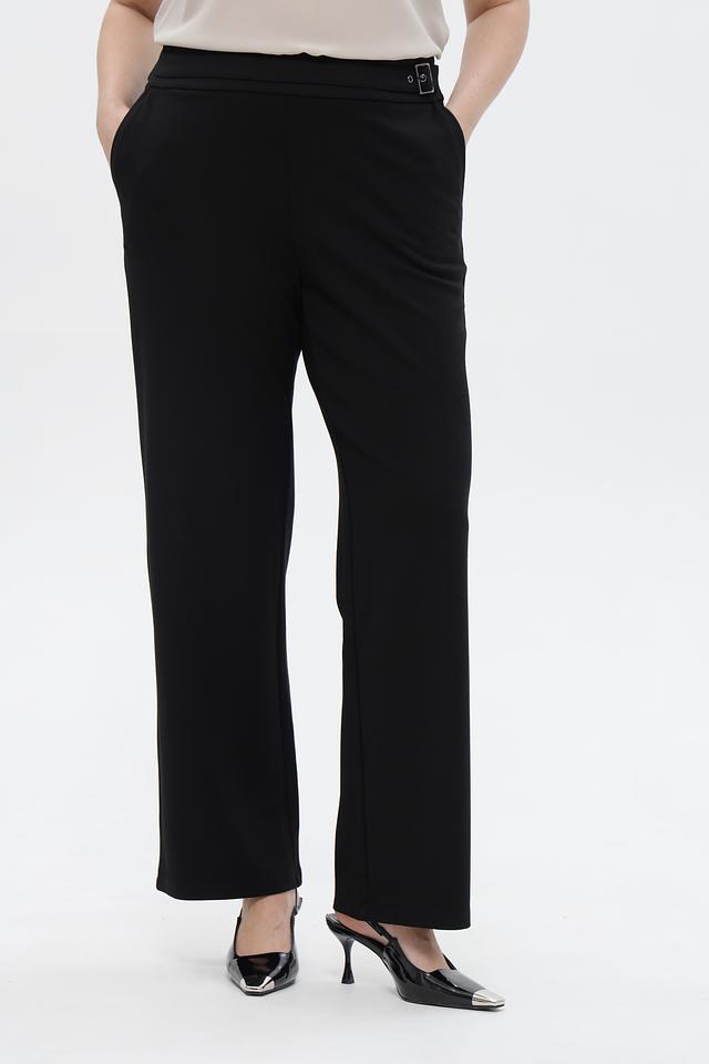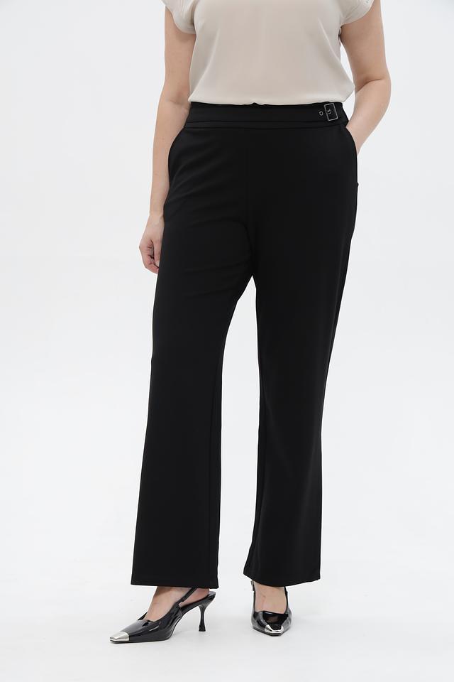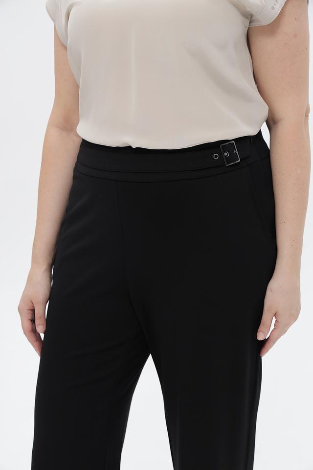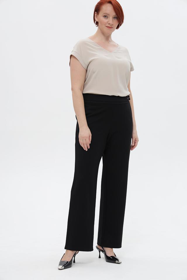 Брюки имеют прямой крой и стандартную посадку по фигуре. Отличительной особенностью является пояс с декоративной пряжкой, который акцентирует талию и придает образу завершенность. Ткань, состоящая из вискозы, полиамида и эластана, обеспечивает комфорт в носке, приятные тактильные ощущения и хорошую износостойкость.