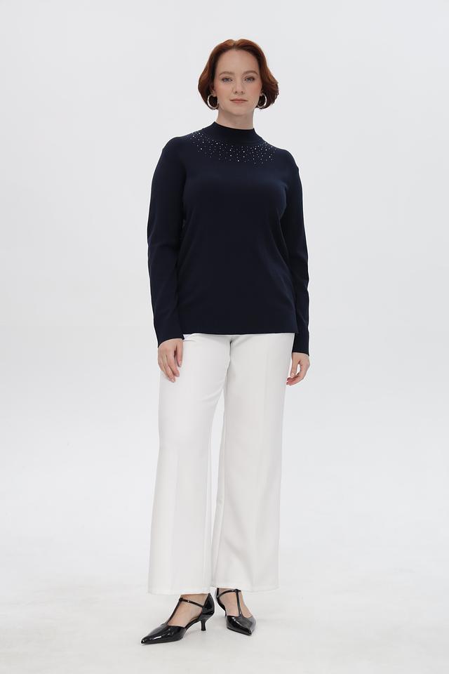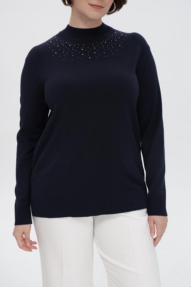 Особенность пуловера — декоративная отделка в виде небольших камней, расположенных в верхней части изделия. Эта деталь придает образу изысканность и делает пуловер подходящим для особых случаев.
