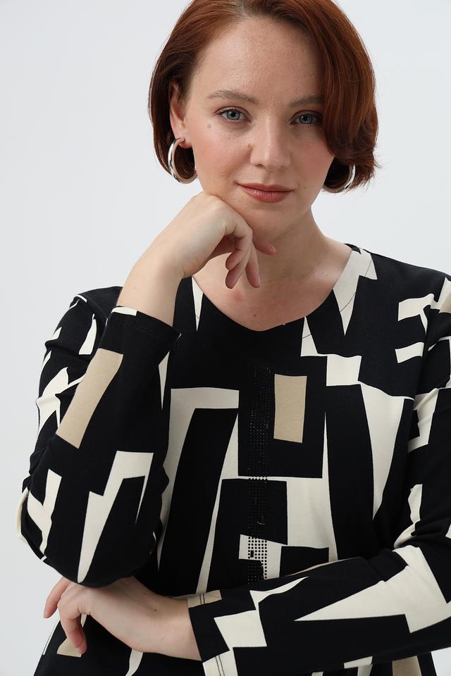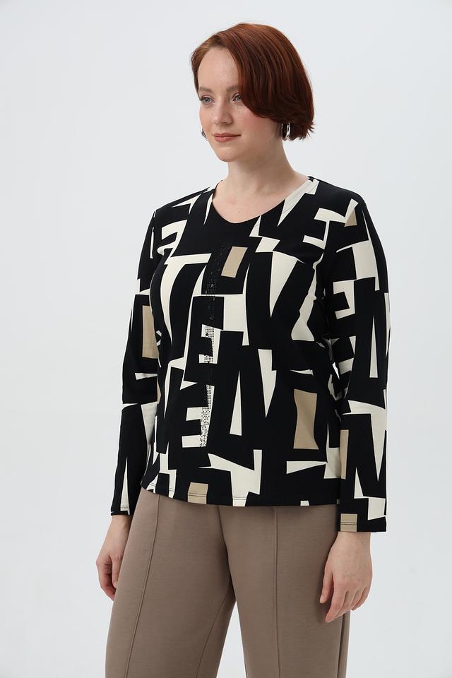 Особенность этой модели – оригинальный абстрактный принт в бежевых, чёрных и кремовых оттенках, который добавит образу индивидуальности и стиля. Лонгслив прекрасно сочетается с юбками, брюками и джинсами, позволяя создавать разнообразные образы для работы, отдыха или особых случаев.