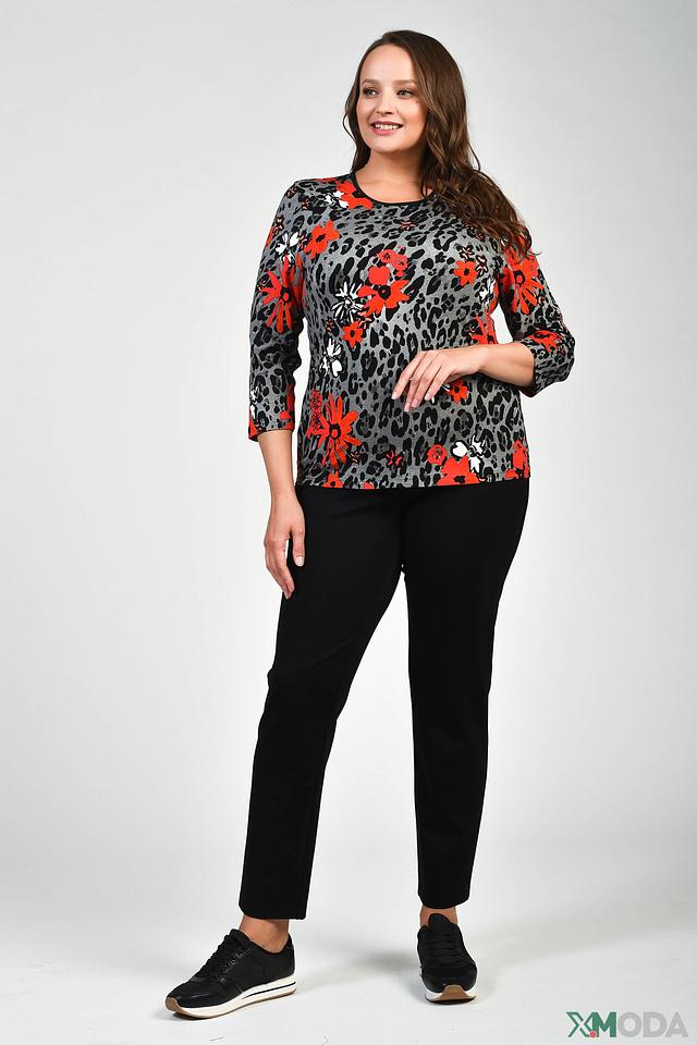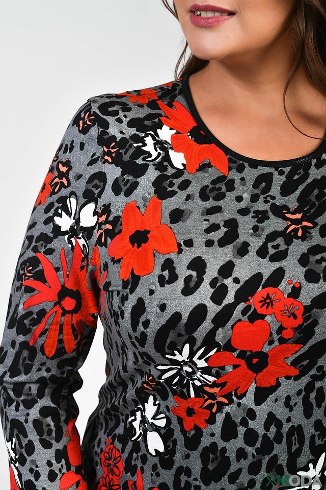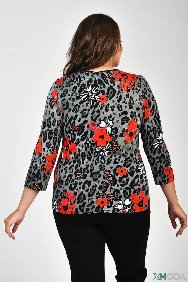 Футболка имеет оригинальный принт, сочетающий в себе леопардовый узор и яркие красные цветы. Рукава длиной 3/4 делают ее универсальной для любого времени года. Круглый вырез горловины.