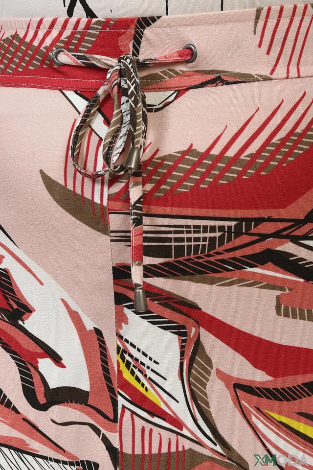 Юбка имеет длину миди и классический крой, который подходит для любой фигуры. Особенностью модели является эффектный цветочный принт, выполненный в насыщенных оттенках красного, коричневого и чёрного на нежно-розовом фоне. Застёжка на молнию сбоку и шнуровка на талии позволяют регулировать посадку по фигуре.