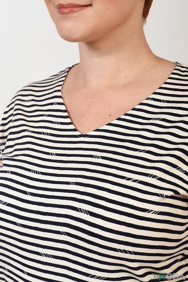 Топ имеет классический крой с короткими рукавами и V-образным вырезом, который визуально удлиняет шею и делает силуэт более изящным. Чёрно-белая полоска добавляет образу динамичности и универсальности.