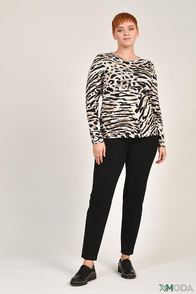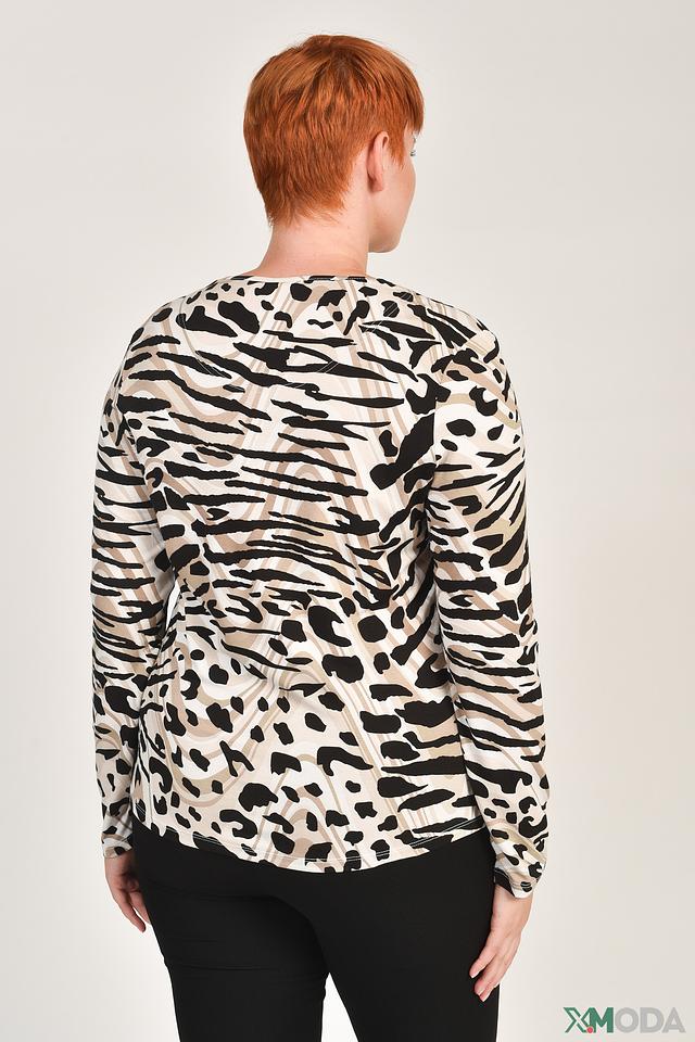 Особенностью данной модели является стильный принт, сочетающий в себе элементы зебры и леопарда в бежево-коричневой гамме. Блуза имеет длинные рукава и круглый вырез горловины.