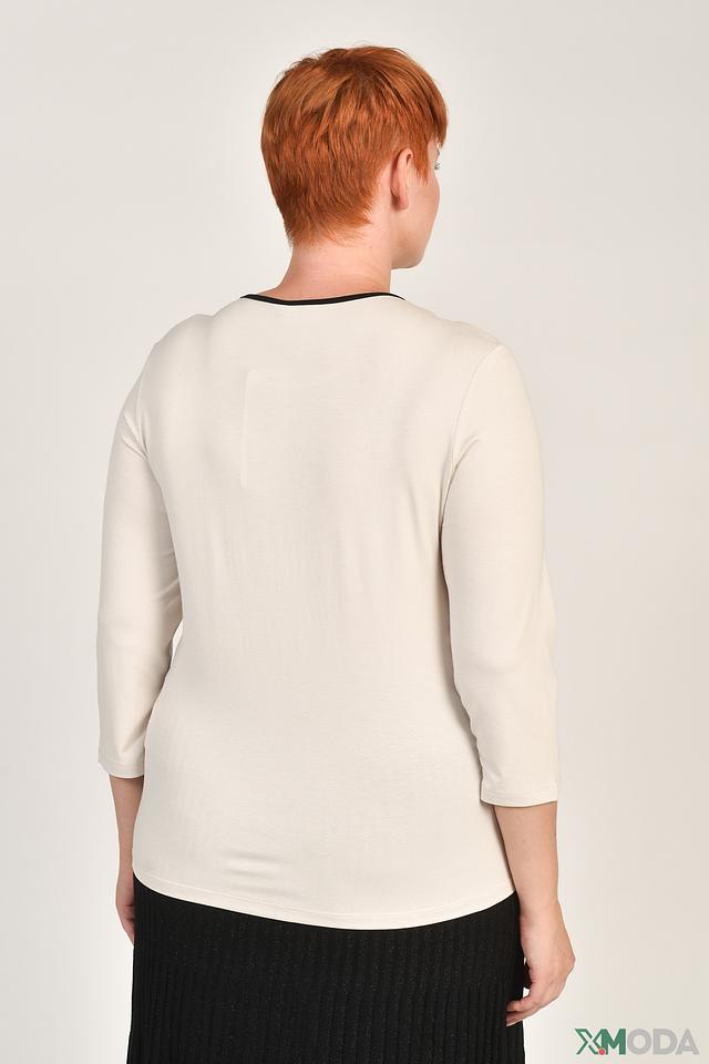 Основной цвет футболки – бежевый, который прекрасно сочетается с различными оттенками. Главная особенность модели – яркий абстрактный принт в коричнево-бежевой гамме, который добавляет образу оригинальности и стиля. Вырез горловины и манжеты рукавов отделаны тонкой черной полоской, что придает завершенность дизайну.