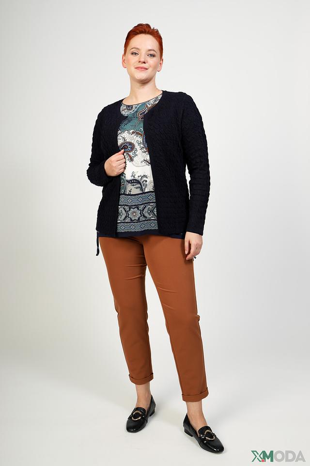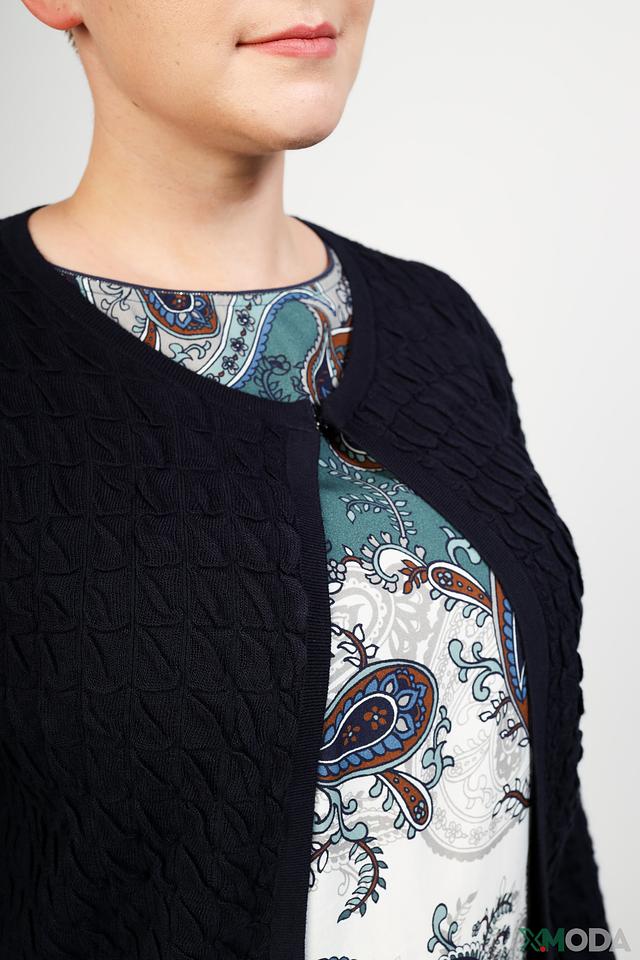 Особенностью модели является текстурная вязка, придающая жакету оригинальный вид. Прямой крой обеспечивает свободу движений, а оптимальная длина делает его универсальным для разных типов фигур.