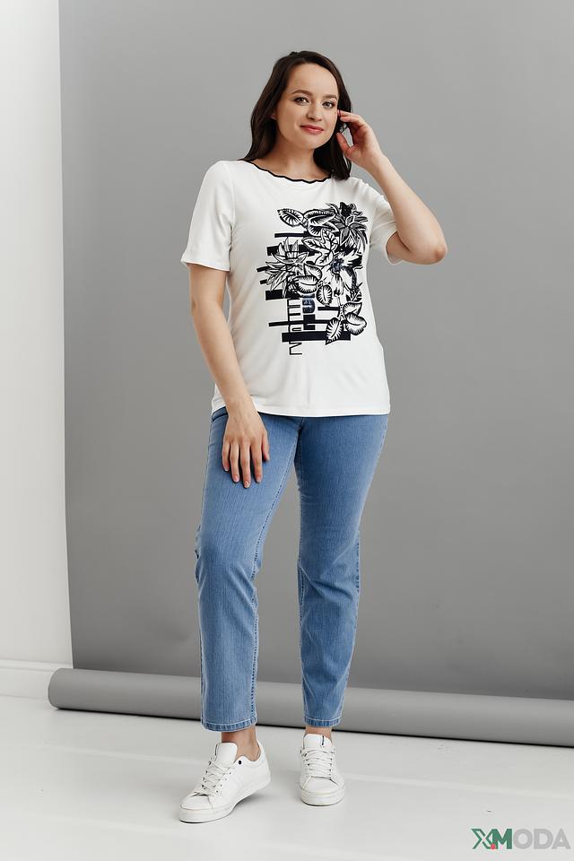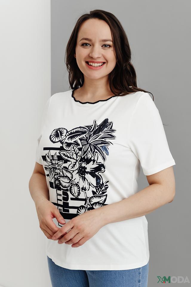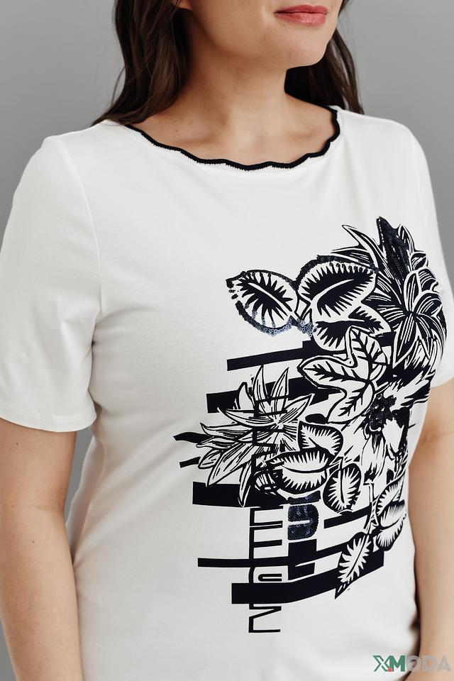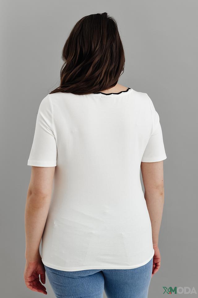 Футболка имеет прямой крой, короткие рукава и круглый вырез горловины, отделанный тонкой чёрной тесьмой с декоративной оборкой. Изготовлена из высококачественной вискозы с добавлением эластана, что обеспечивает приятные тактильные ощущения и хорошую посадку по фигуре.