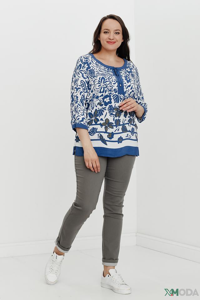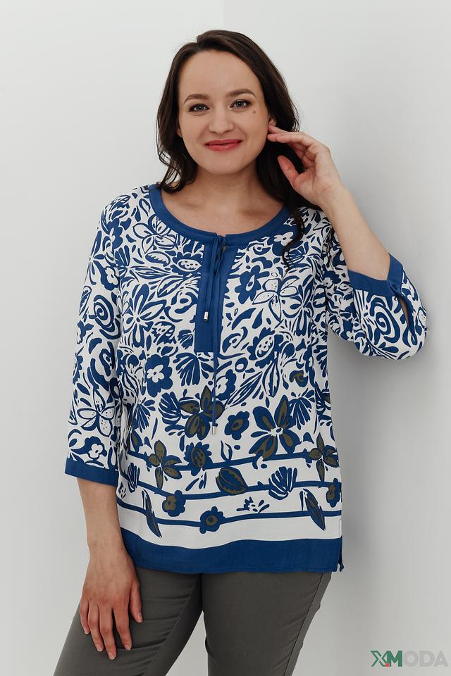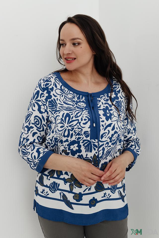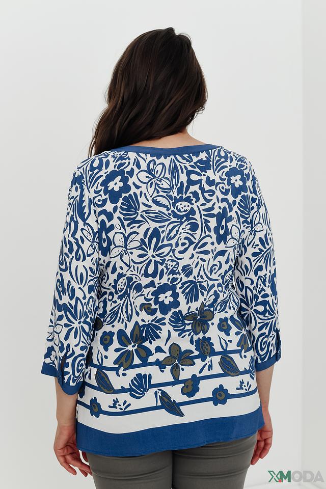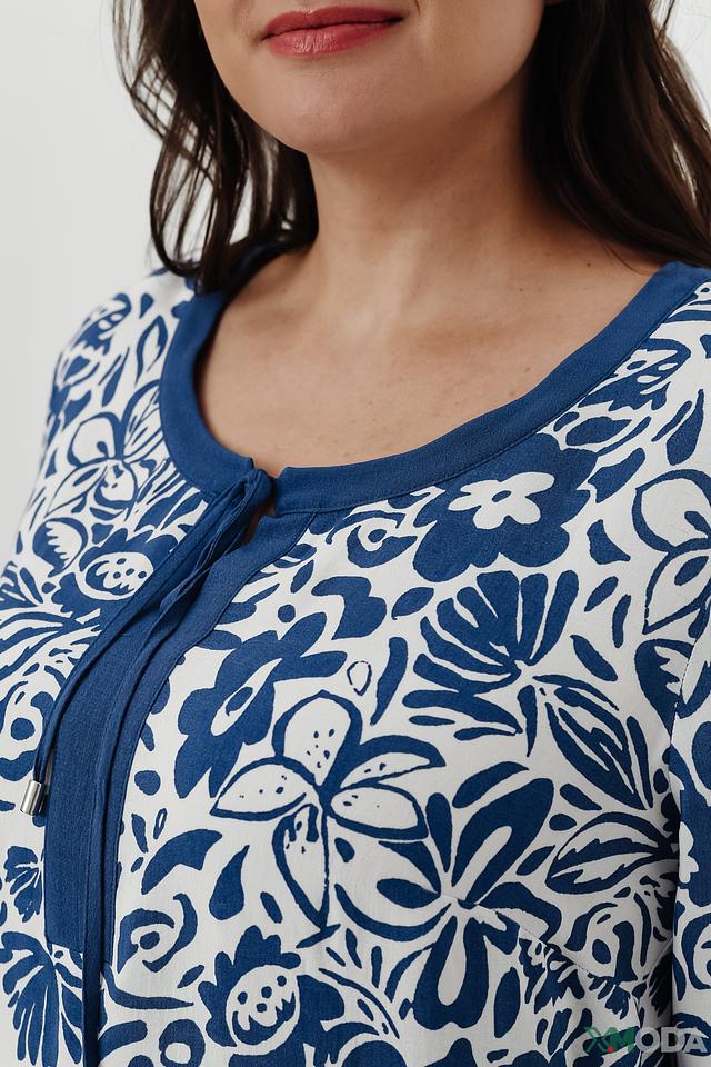 Основной цвет блузы – белый, украшенный ярким и красочным цветочным принтом в синих тонах. V-образный вырез горловины дополнен завязками, которые позволяют регулировать глубину выреза и создавать различные силуэты.