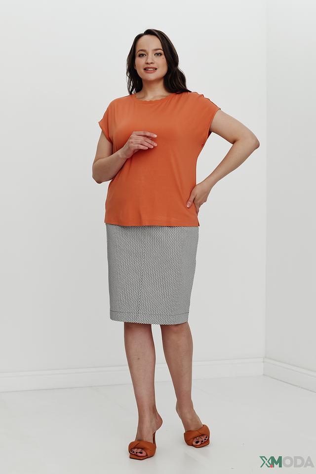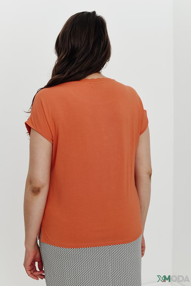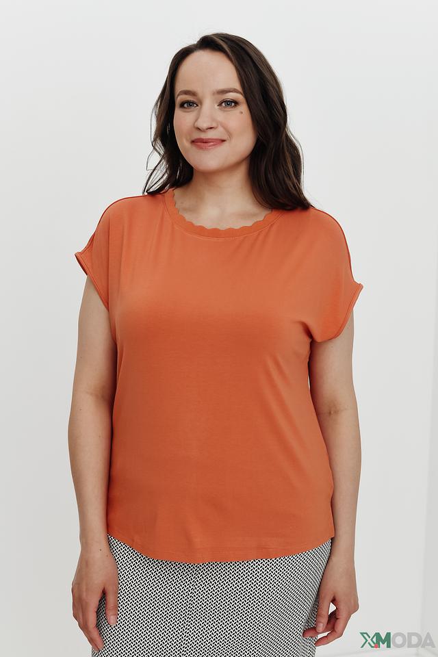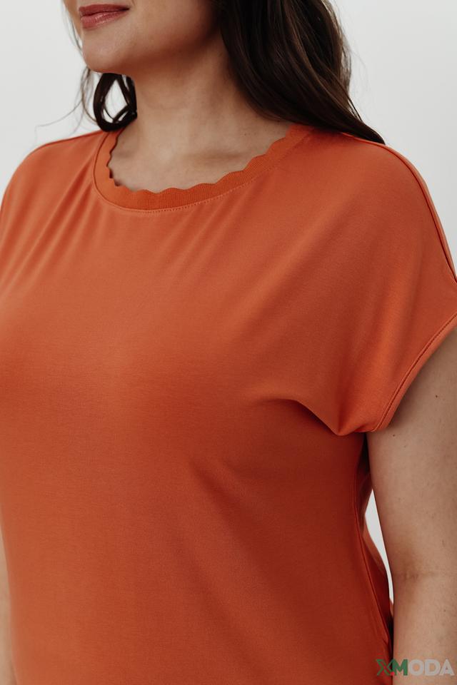 Оранжевый цвет футболки добавит яркости и позитива вашему образу. Короткие рукава и слегка закругленный вырез горловины с декоративной обработкой создают стильный и современный вид.