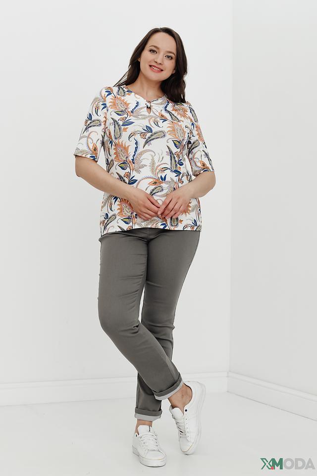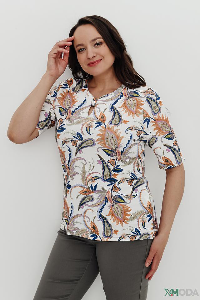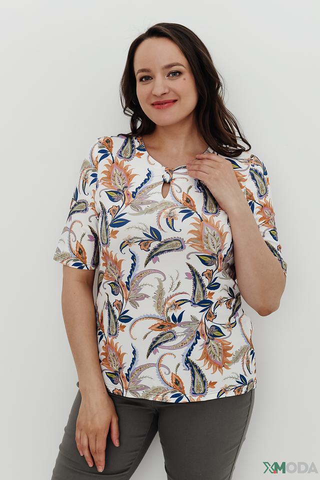 Модель имеет округлый вырез горловины с небольшой фигуркой в форме капли. Короткие рукава делают блузу идеальной для теплой погоды. Блуза выполнена из качественной вискозы с добавлением эластана, что обеспечивает приятные тактильные ощущения и хорошую посадку по фигуре.