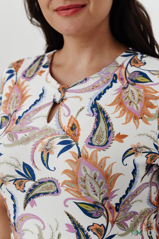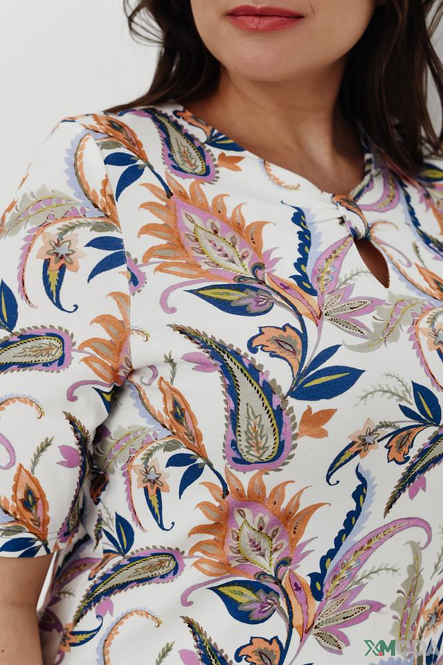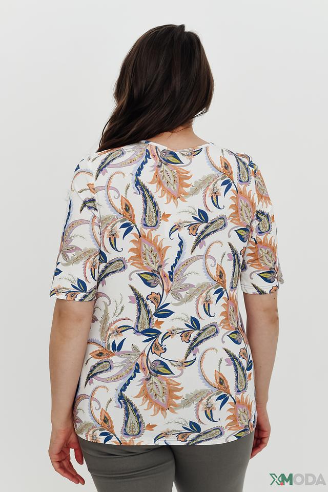 Белая блуза Lebek с ярким цветочным принтом пейсли станет отличным дополнением к вашему гардеробу. Модель выполнена из мягкой вискозы с добавлением эластана, что обеспечивает комфорт и удобство в носке. Состав: вискоза 96%, эластан 4%