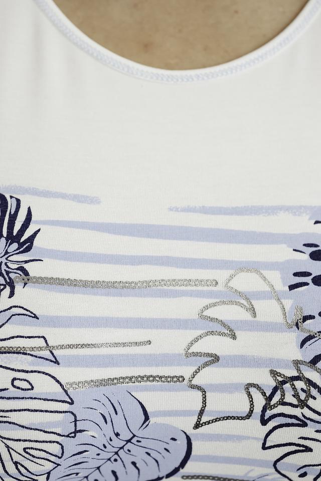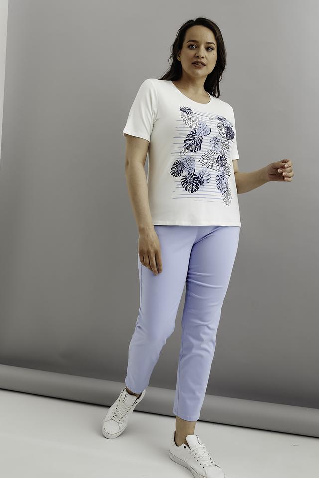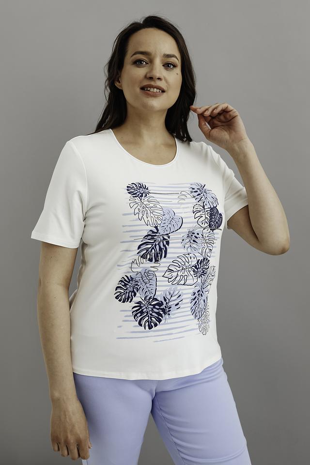 Основной цвет футболки – белый, что делает ее универсальной и легко сочетаемой с другими элементами одежды. Главная особенность модели – яркий цветочный принт в синих тонах, который добавляет образу свежести и оригинальности.