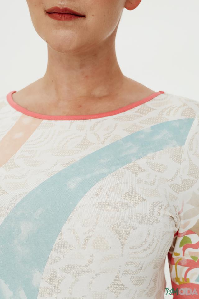 Особенностью данной модели является яркий и необычный абстрактный принт, выполненный в нежных пастельных тонах. Сочетание светло-бежевого фона с элементами голубого, розового и зеленого цветов делает эту футболку по-настоящему уникальной.