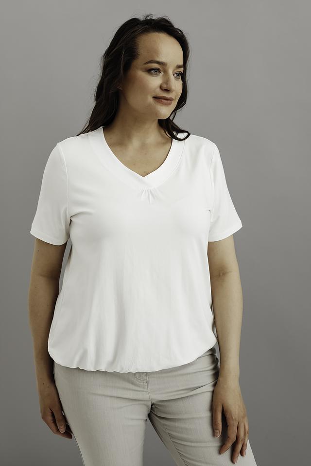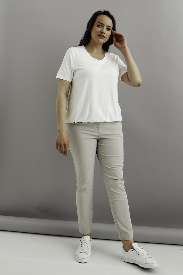 Модель имеет прямой крой и короткие рукава, что обеспечивает свободу движений и комфорт в жаркую погоду. V-образный вырез горловины украшен деликатной сборкой, придающей футболке женственность и изящество.