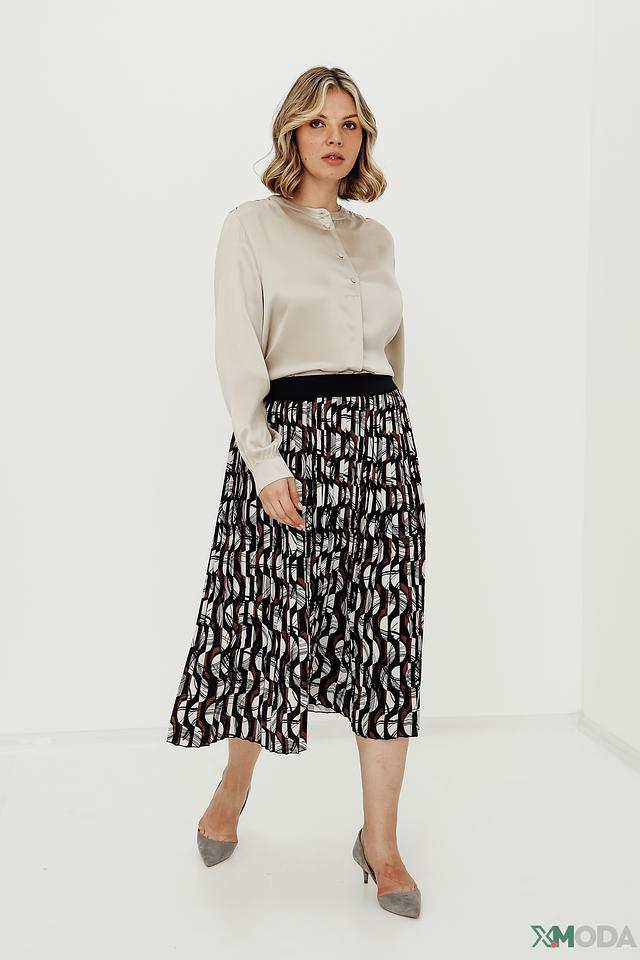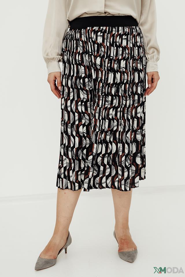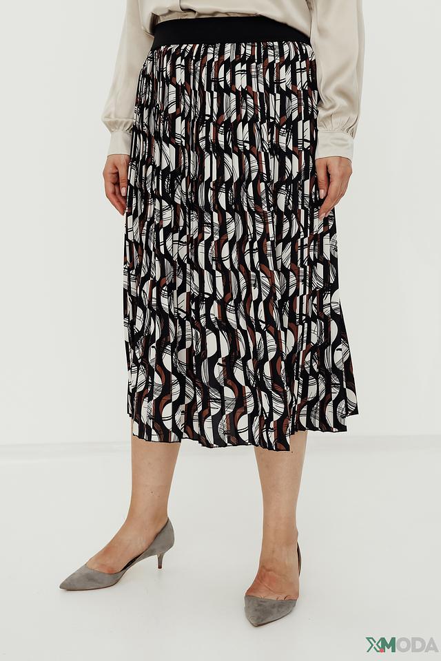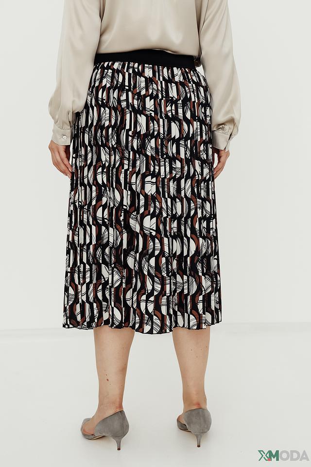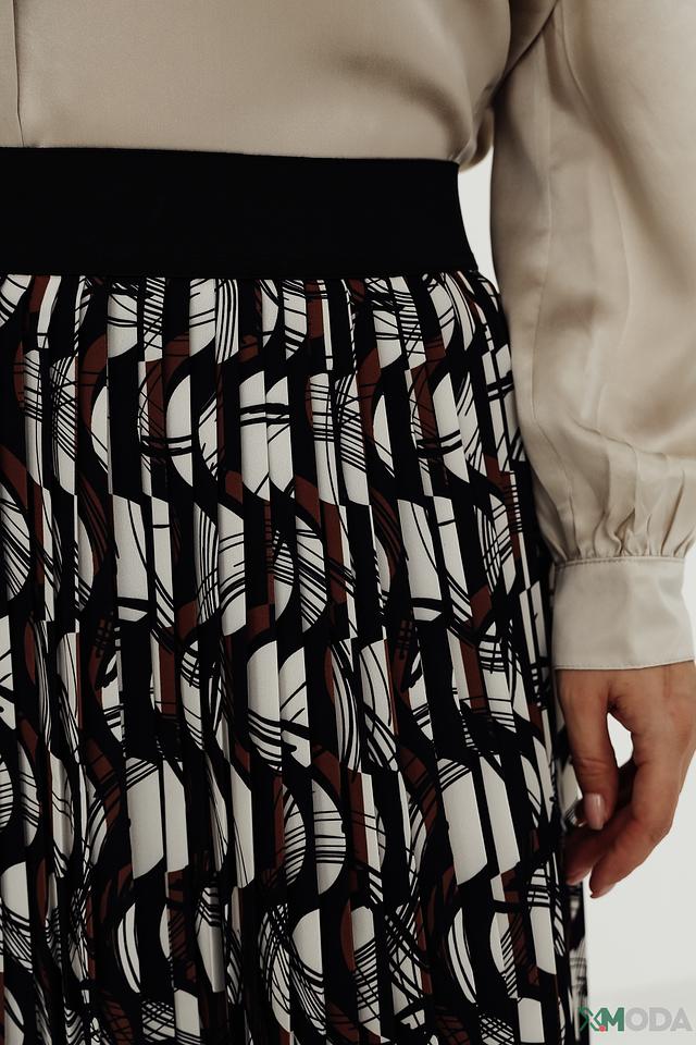 Юбка имеет длину миди и выполнена в виде плиссе, что придает ей элегантность и динамичность. Особенностью данной модели является оригинальный геометрический принт, сочетающий в себе чёрный, коричневый и белый цвета.