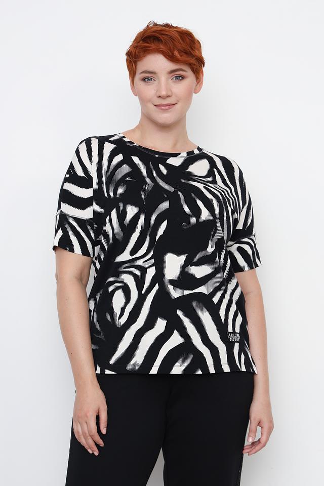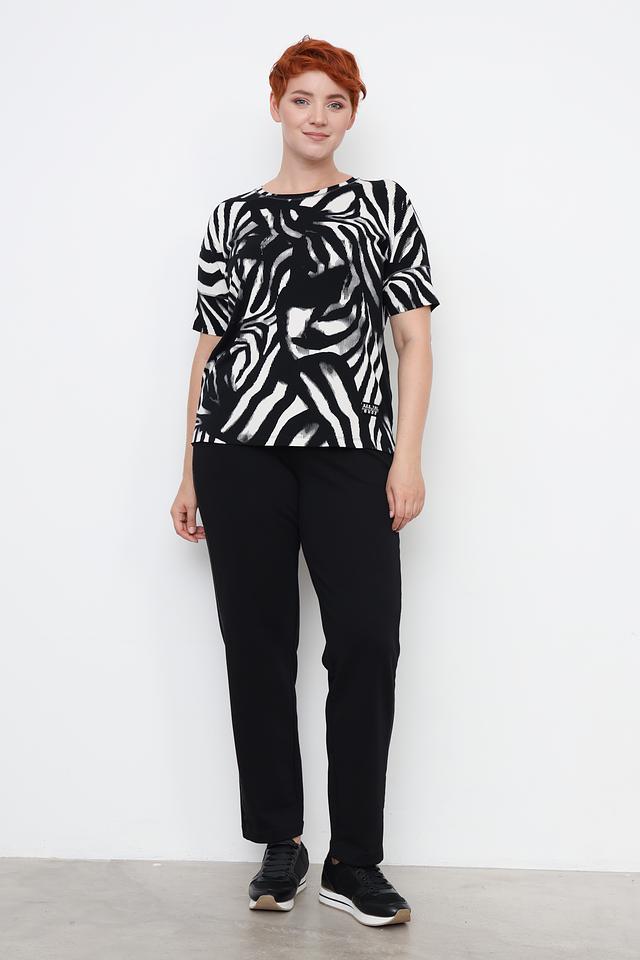 Основной цвет футболки – чёрный, украшенный ярким принтом в виде полос зебры. Принт выполнен в белом цвете, создавая контрастный и эффектный образ. Футболка имеет круглый вырез горловины и короткие рукава, что делает её идеальной для тёплой погоды.