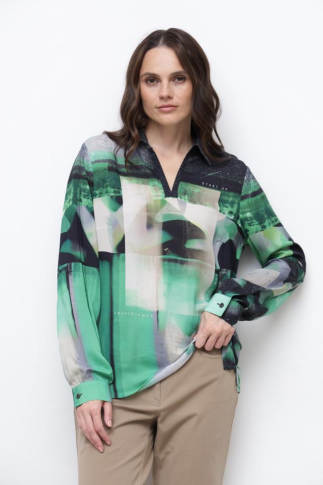 Блуза имеет свободный крой, длинные рукава и классический воротник. Главная особенность модели – яркий абстрактный принт, сочетающий в себе различные оттенки зеленого, черного и белого. Такой рисунок добавит образу оригинальности и индивидуальности.