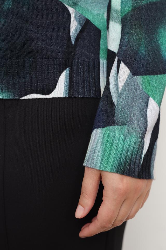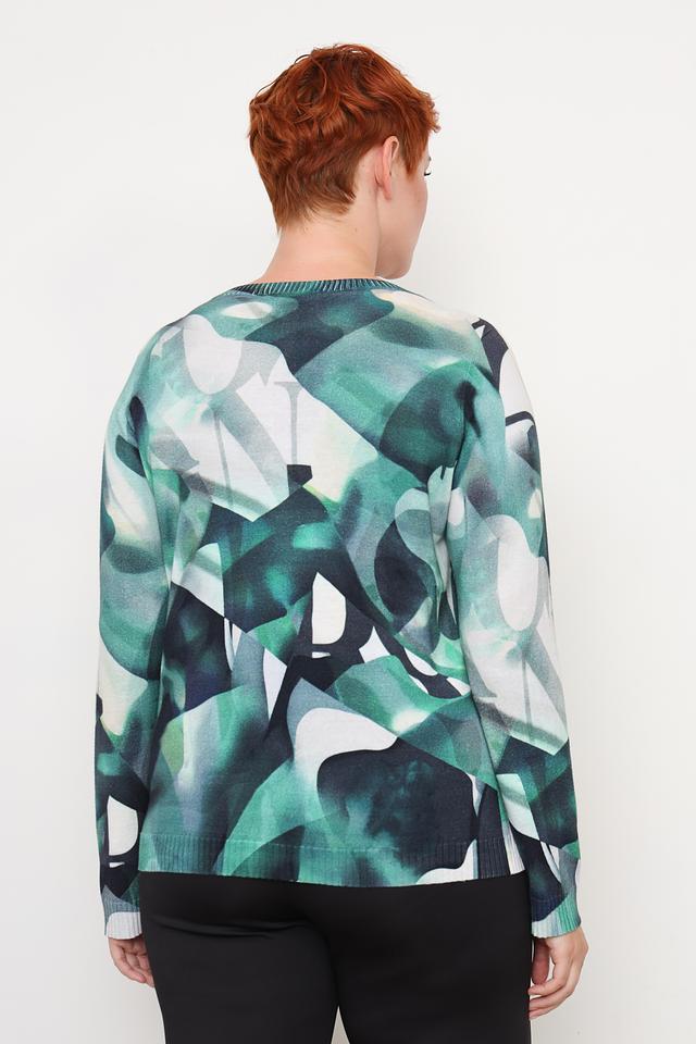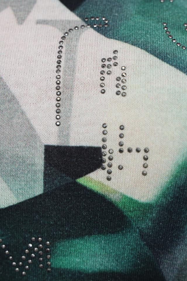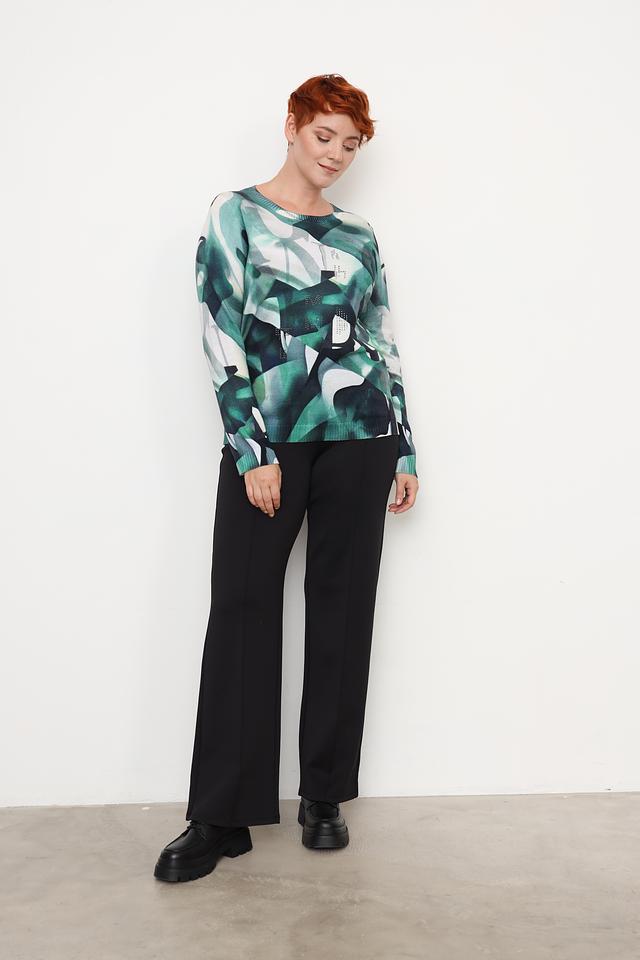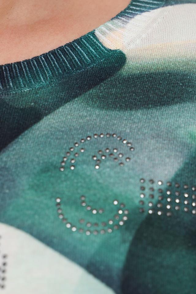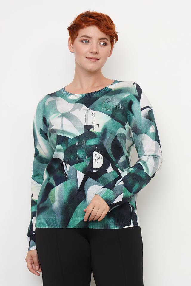 Пуловер имеет свободный крой и круглый вырез горловины. Главная особенность модели – яркий абстрактный принт, сочетающий в себе различные оттенки зеленого и белого. Дополнительный декор представлен в виде небольших страз, аккуратно расположенных на передней части изделия.