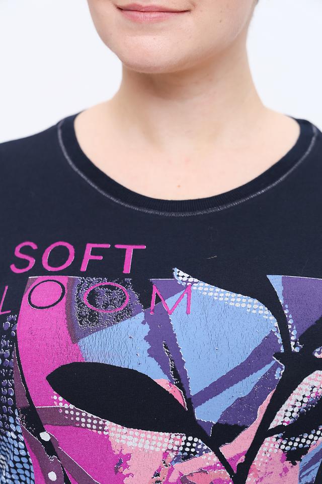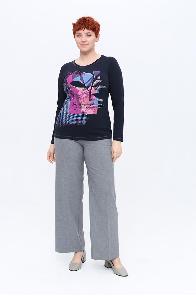 Лонгслив имеет классический крой и округлый вырез горловины. Главной особенностью модели является яркий цветочный принт, выполненный в насыщенных розовых, фиолетовых и голубых тонах, который добавляет образу женственности и оригинальности.