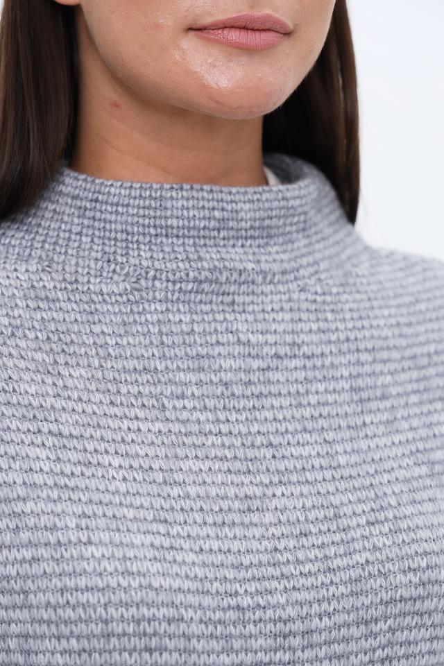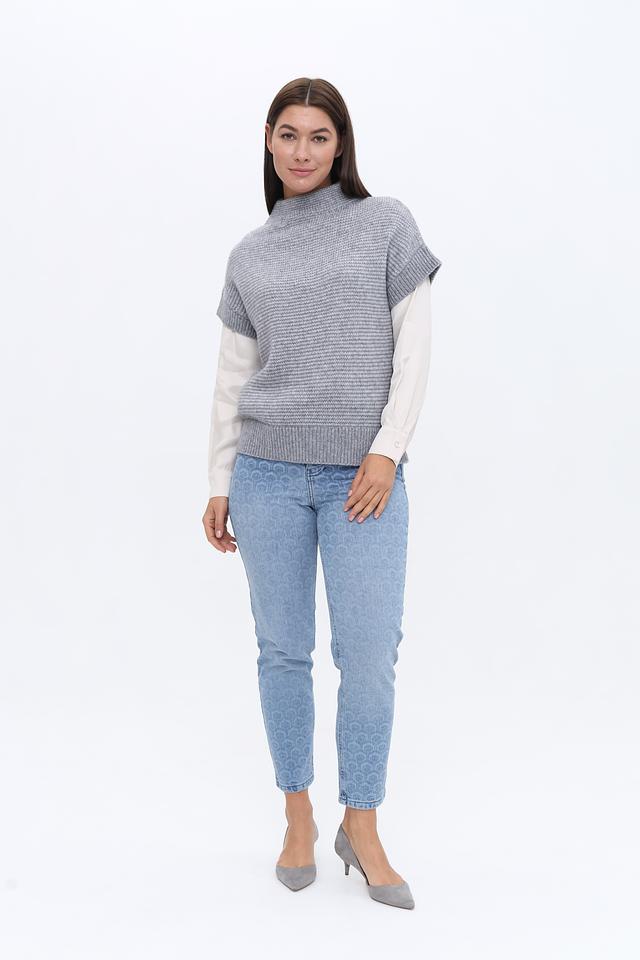 Жилет имеет прямой крой и удобную длину. Высокий воротник добавляет изысканности образу. Вязаная текстура придает изделию уютный и стильный вид.