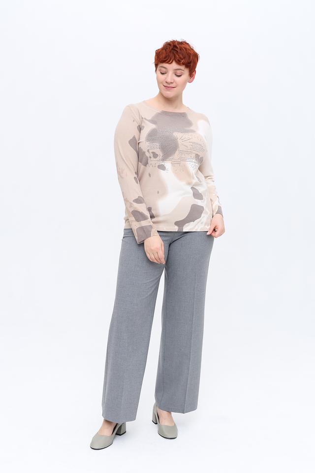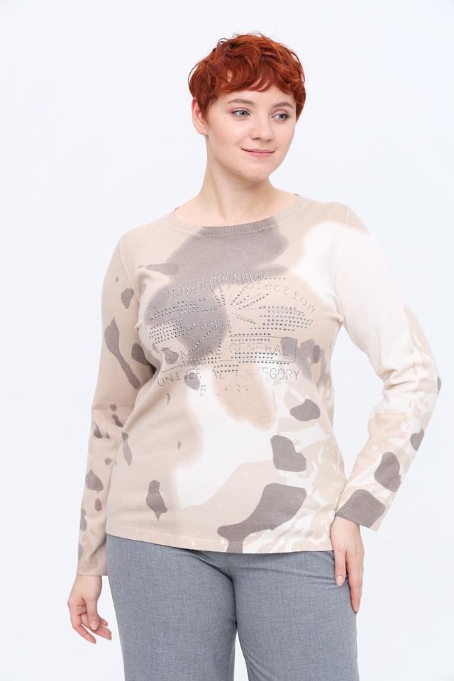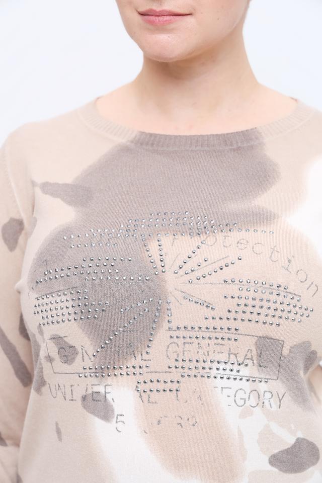 Передняя часть пуловера украшена декоративными стразами, образующими эффектный узор. Вырез горловины – округлый, а длинные рукава обеспечивают комфорт в прохладную погоду.