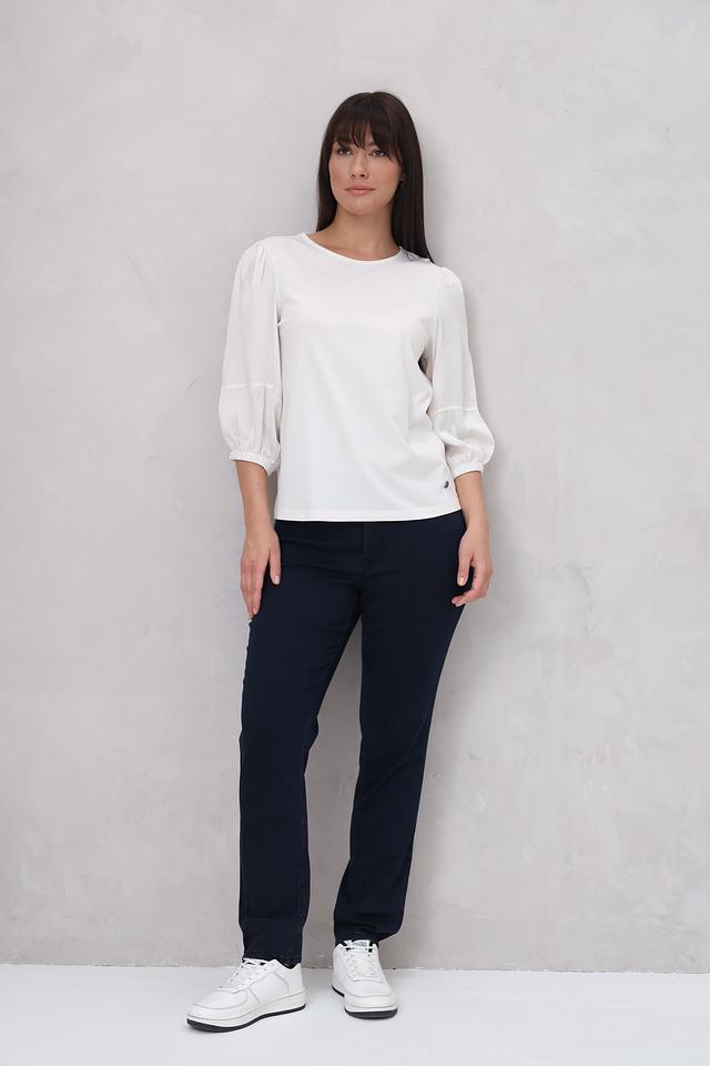 Блуза имеет свободный крой, который не сковывает движений, и рукава-фонарики, придающие ей романтичный вид. Круглый вырез горловины делает модель универсальной и подходящей для любого типа фигуры.