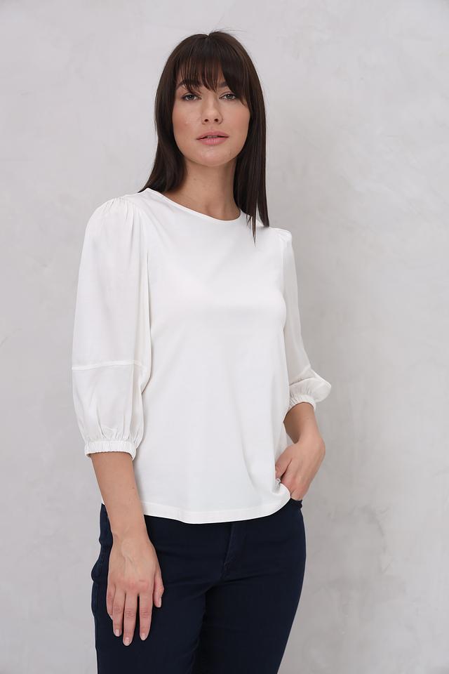 Белая блуза Lecomte с рукавами-фонариками – элегантный выбор для создания женственного образа. Модель выполнена из лёгкой ткани, обеспечивающей комфорт в течение дня, и имеет аккуратный круглый вырез. Состав: хлопок 50%, модал 50%