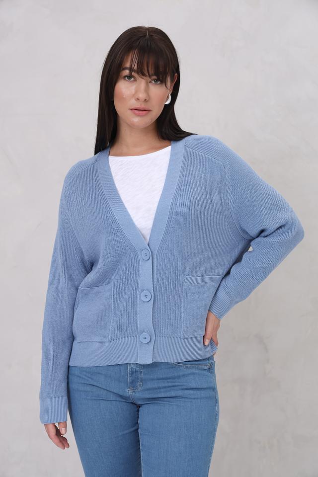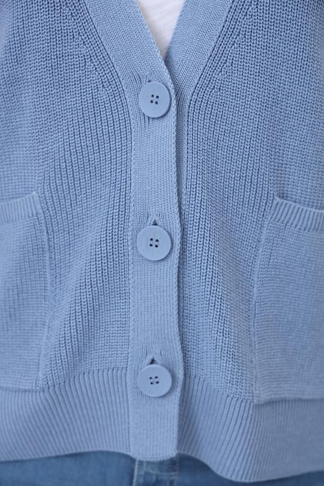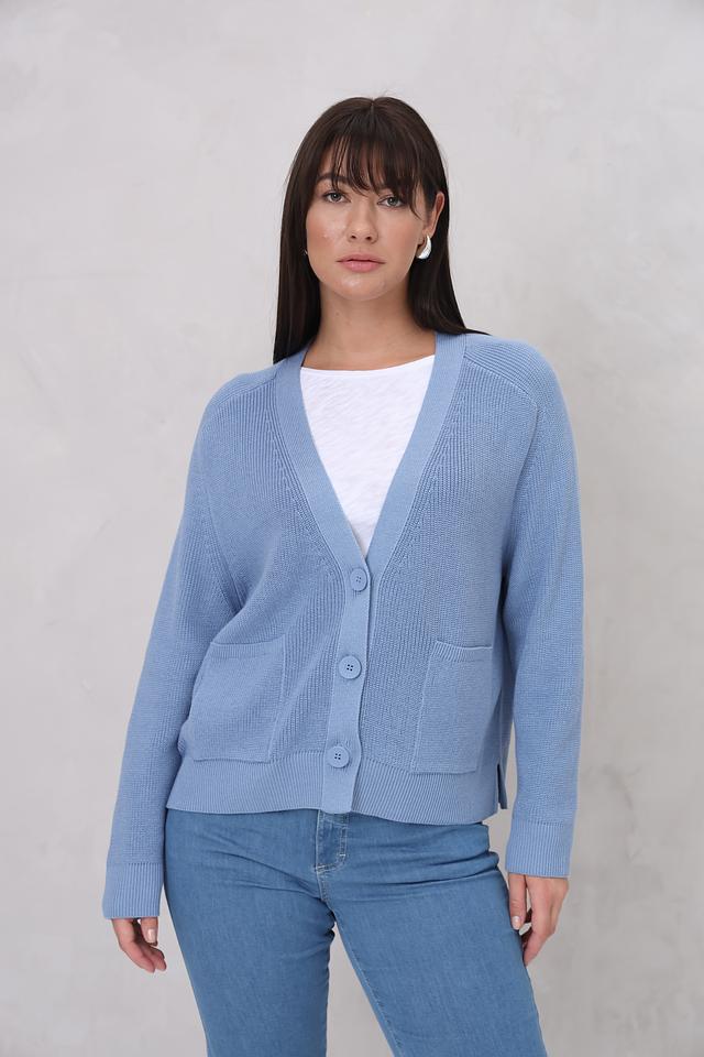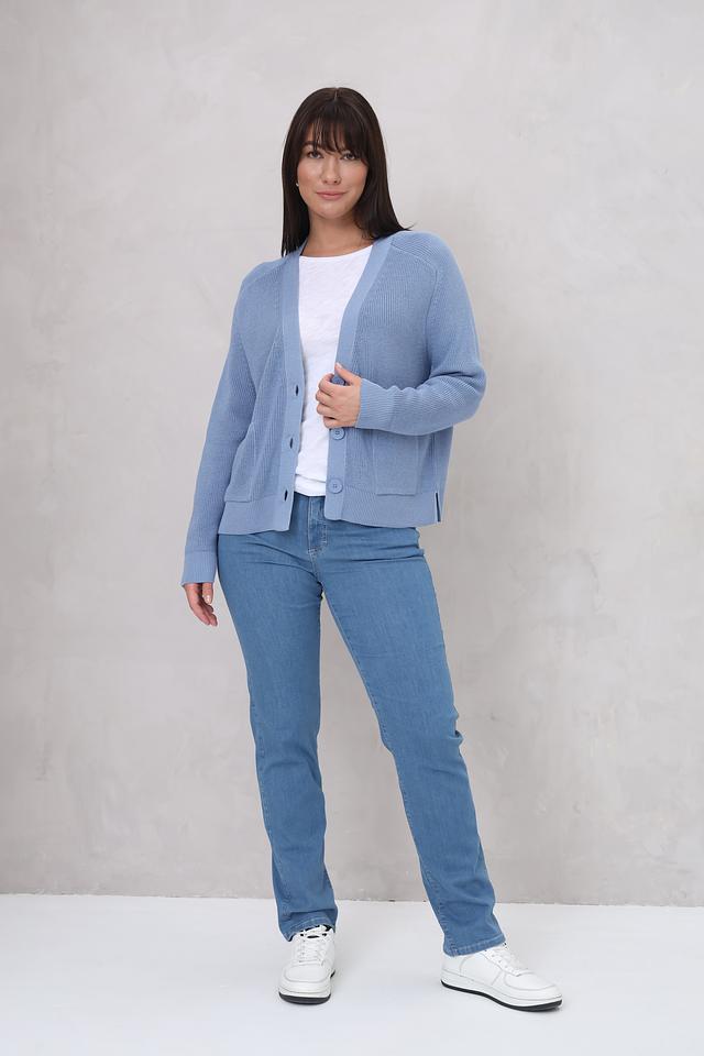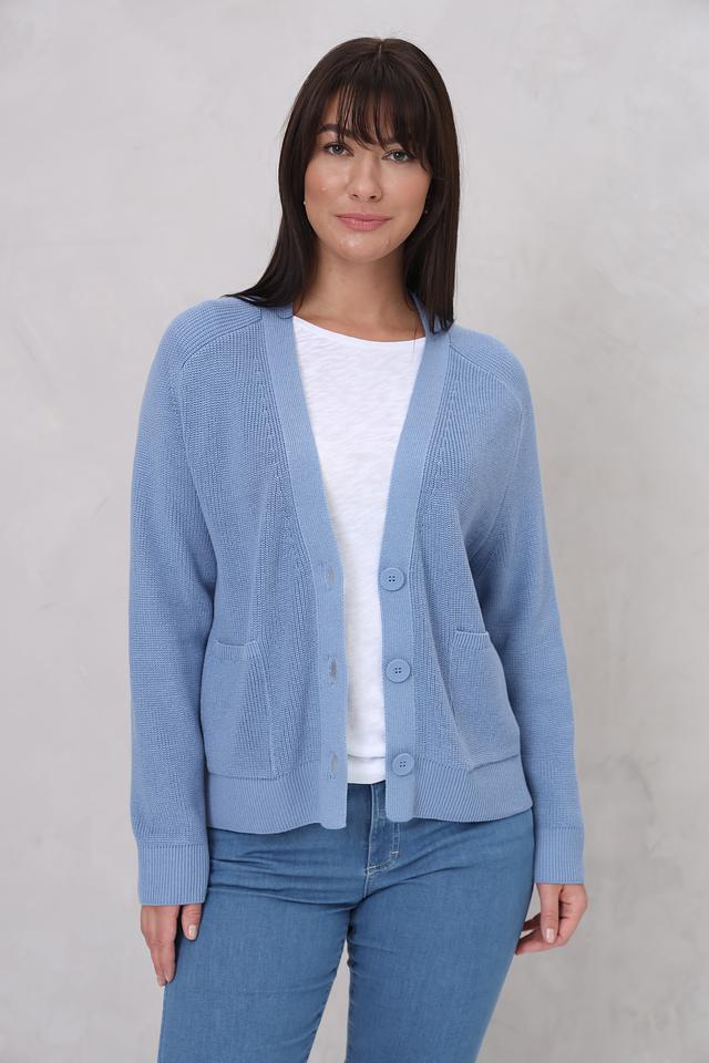 Модель имеет V-образный вырез, застегивается на пуговицы и оснащена двумя удобными карманами. Классический крой кардигана обеспечивает комфортную посадку по фигуре.
